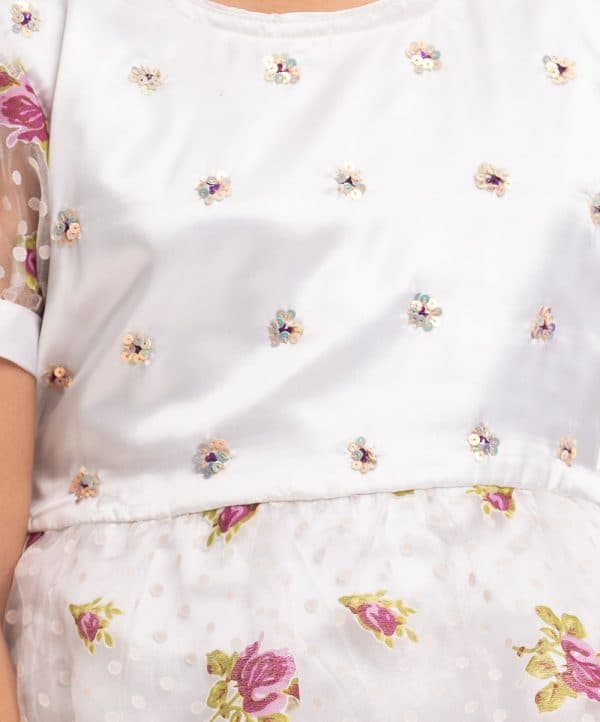 Layered party frock in soft satin and sheer fabric. Round neck, puff sleeves, sequin details at the front. Half viscose lining inside.