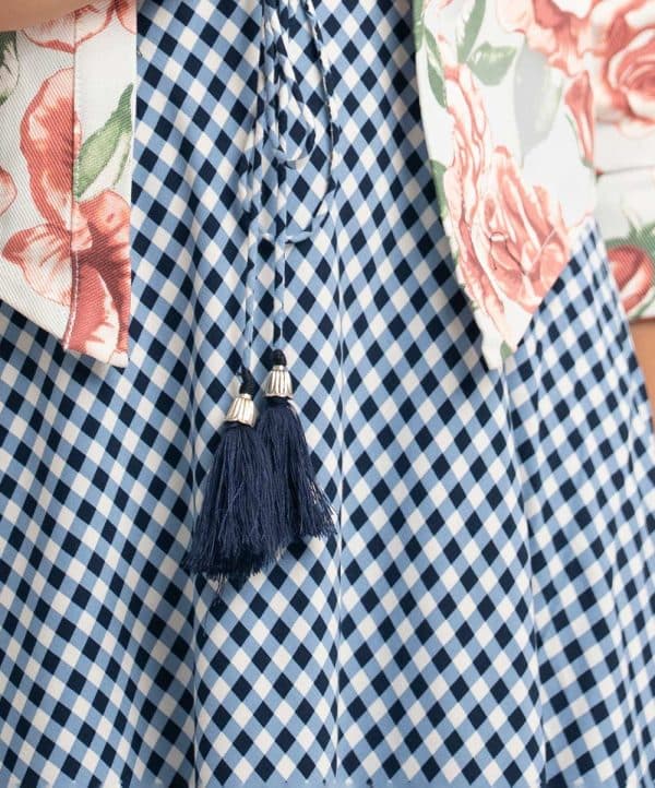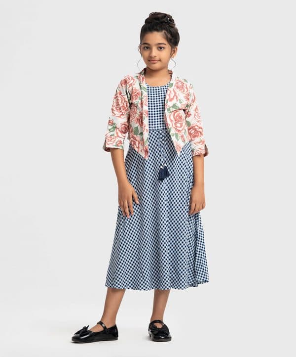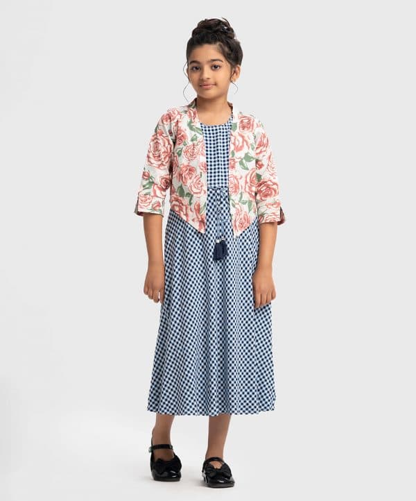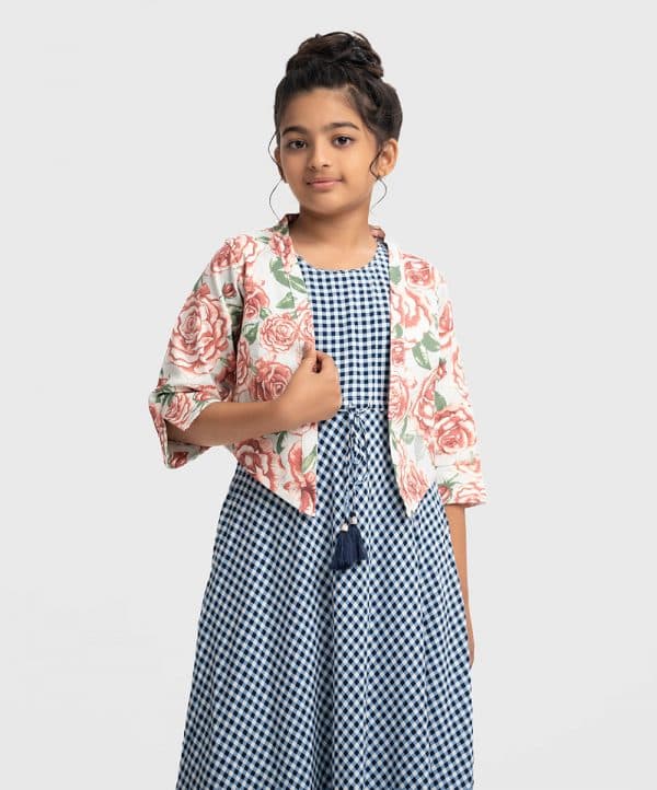 Kid girls frock in check printed viscose fabric with twill fabric koti. Three-quarter slit sleeves, floral printed open front koti. Sleeveless, round collar & front tassel tie frock.