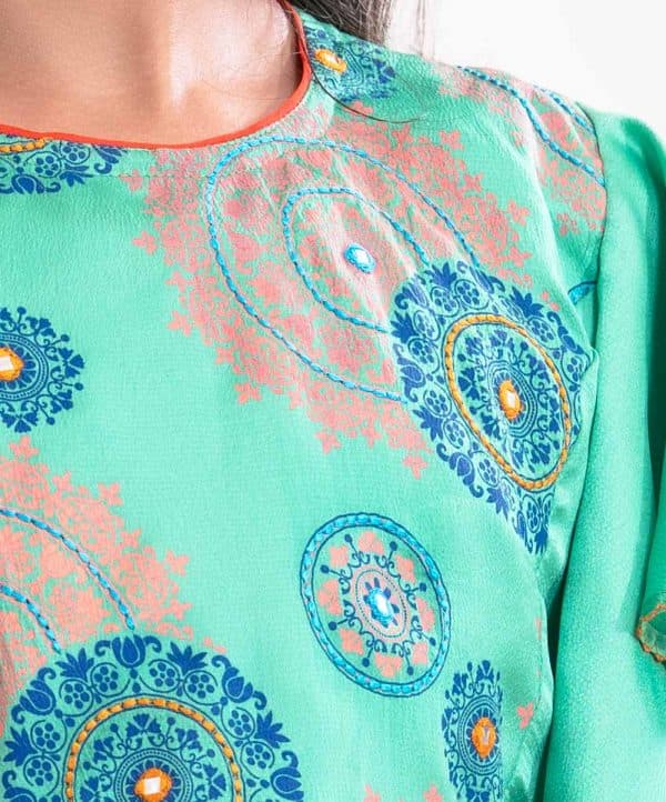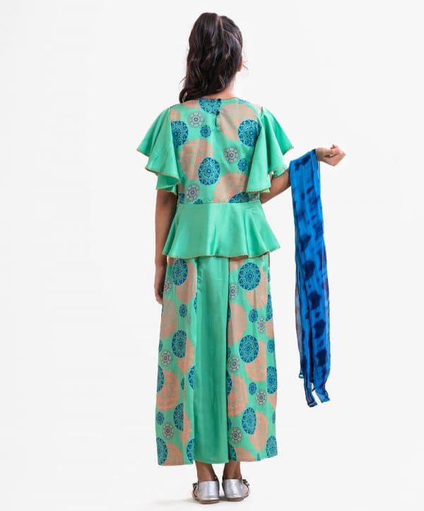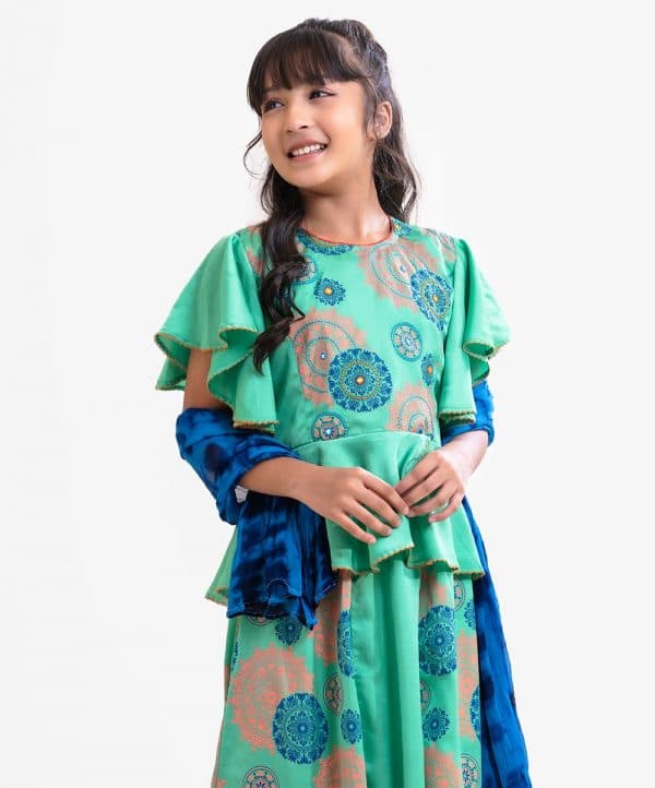 Kid girls printed ghagra choli set in crepe fabric. Butterfly sleeved top with karchupi at front. Tie-dye chiffon dupatta with ethnic printed skirt.