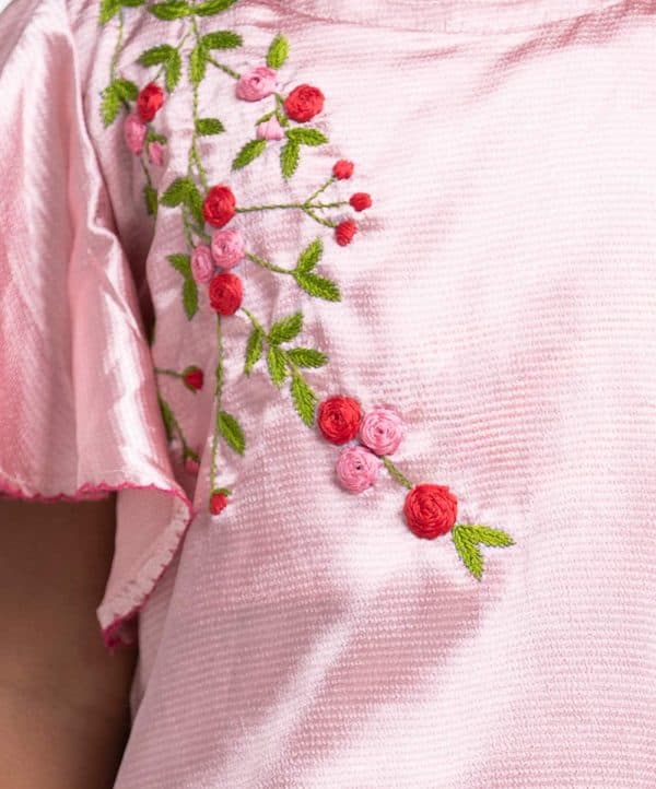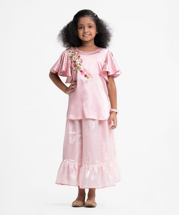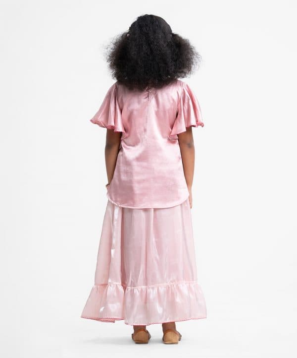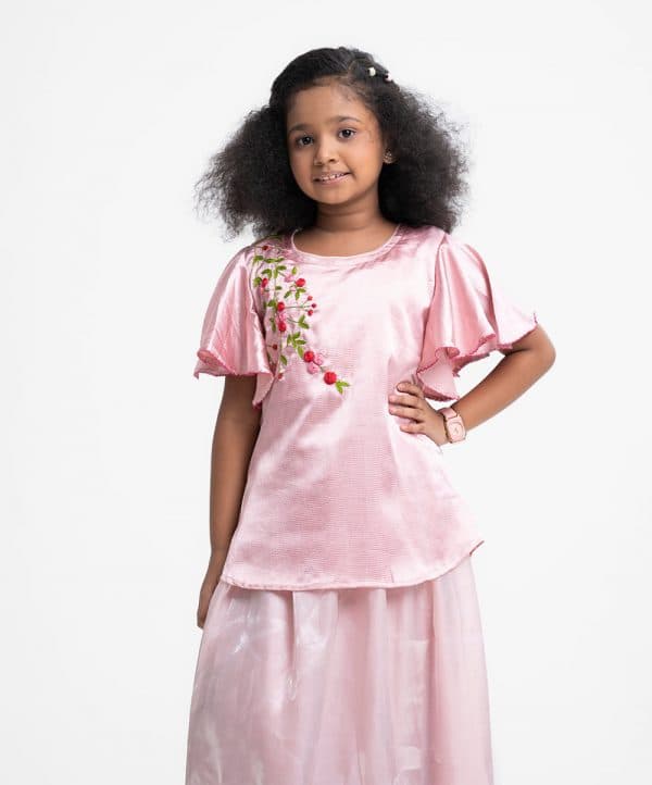 Kid girls ghagra choli set in crepe & georgette fabric. Butterfly sleeves top with karchupi at front. Textured organza skirt with frill at the bottom.