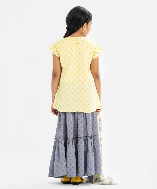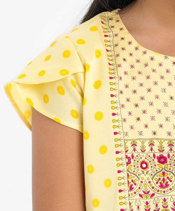 Kid girls printed ghagra choli set in Crepe fabric. Round neck, short-sleeved top with karchupi at front. Tie-dye chiffon dupatta with a printed skirt.