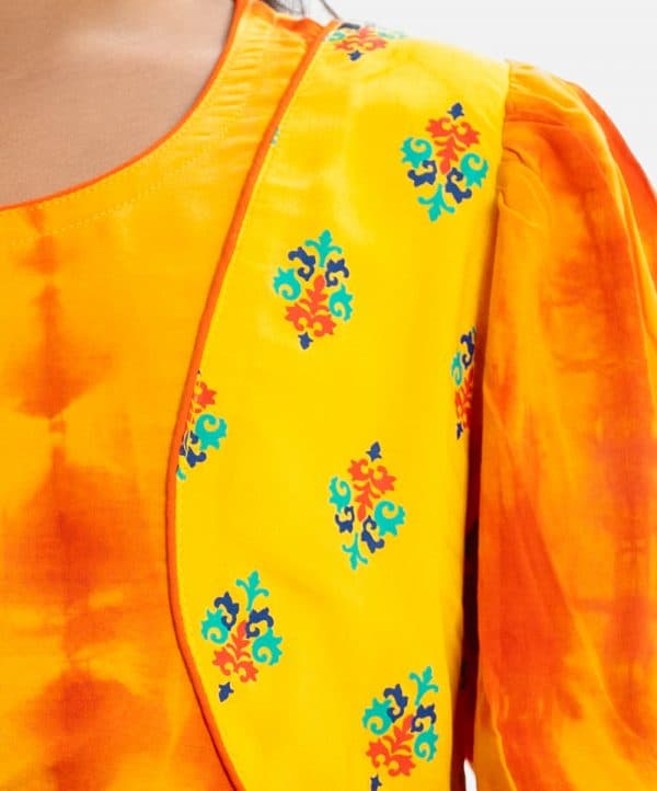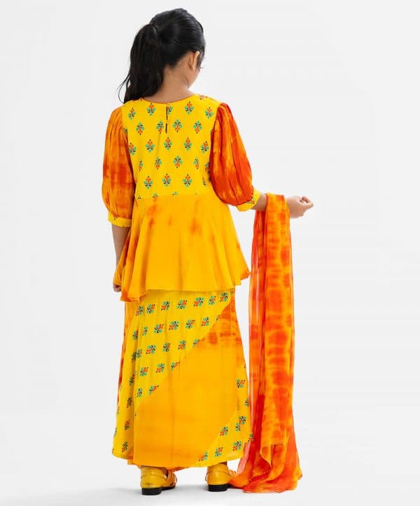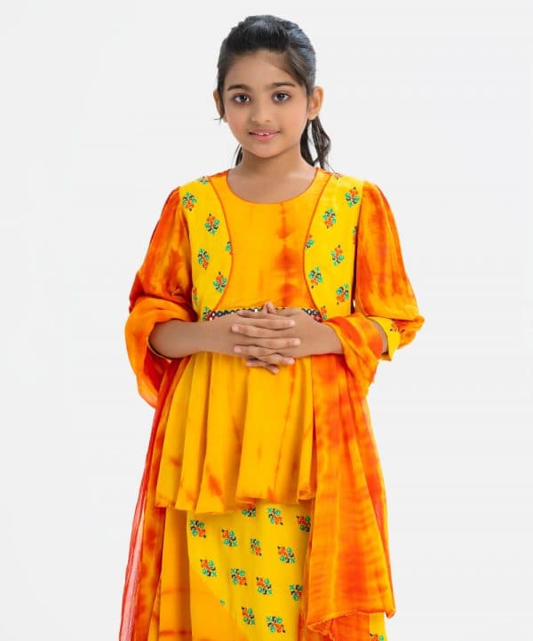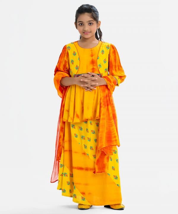 Kid girls tie-dye printed ghagra choli set in viscose fabric. Bishop sleeves, round neck and karchupi at the front on top. A tie-dye chiffon dupatta with a paneled skirt.