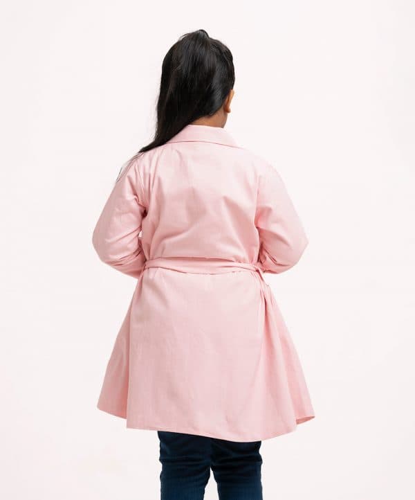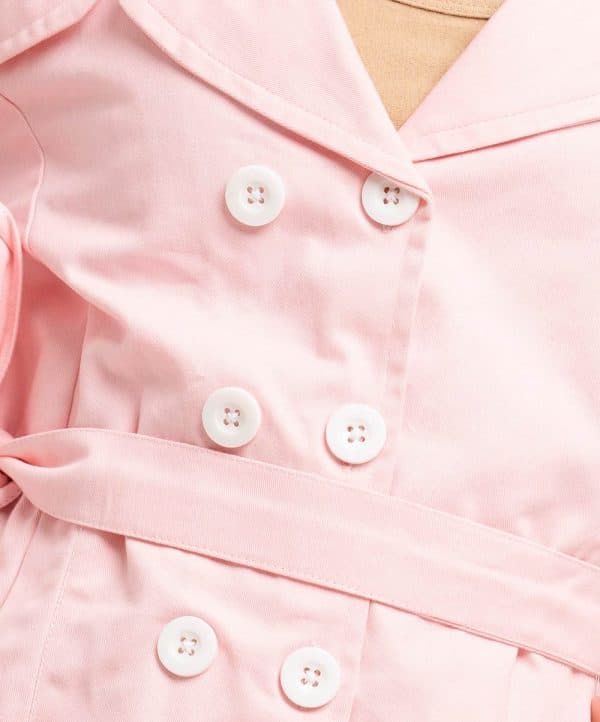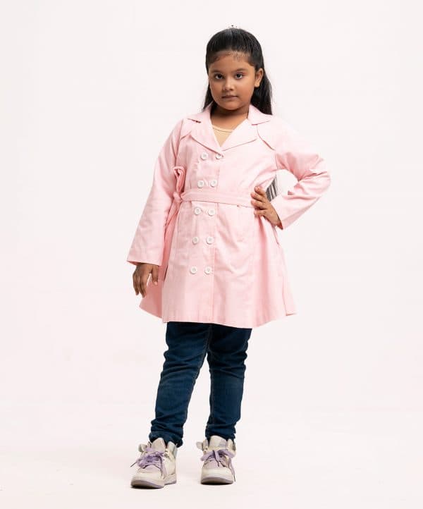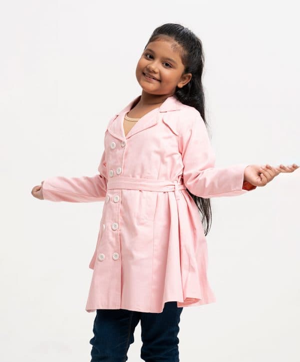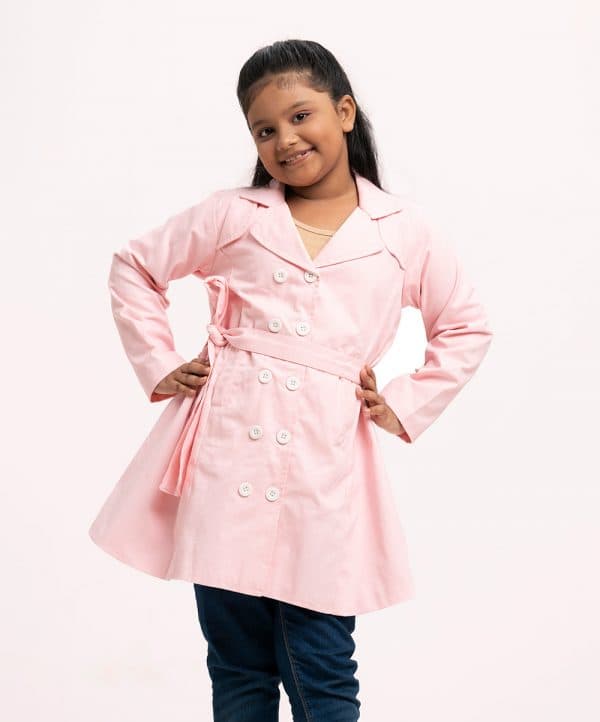 Kid girls double-breasted A-line jacket in twill fabric. Full-sleeved, lapel collar. Front buttons fastening, waist belt and inseam pockets.