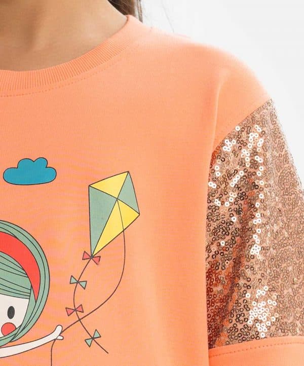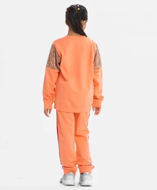 Kid girls’ cartoon-printed top and bottom set in soft French terry fabric. Long-sleeved top with sequined detail and pants with twill tape, elastic waist, and adjustable drawstring.