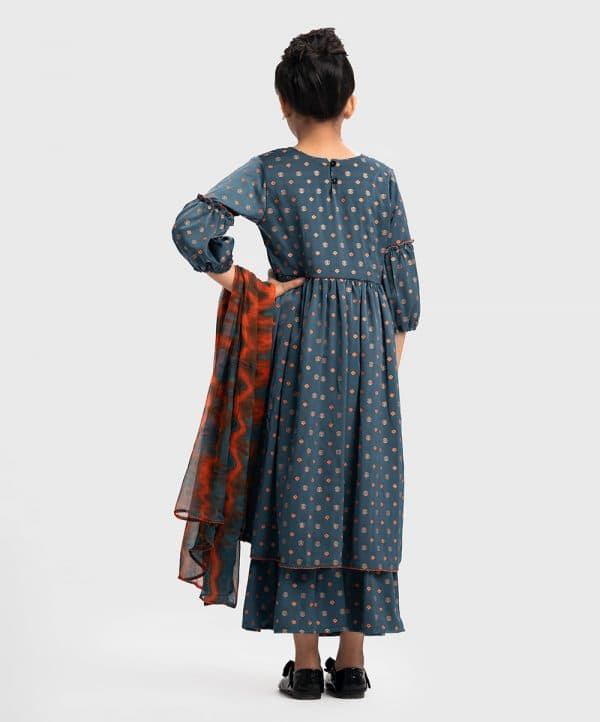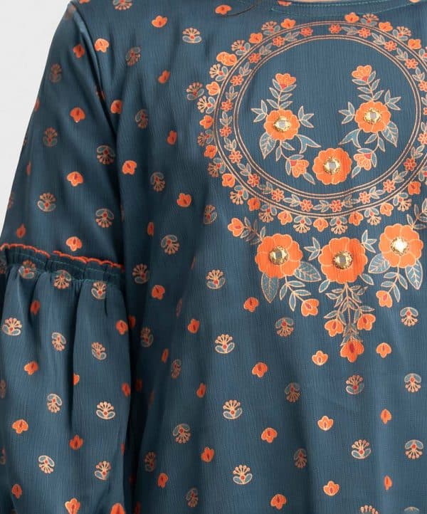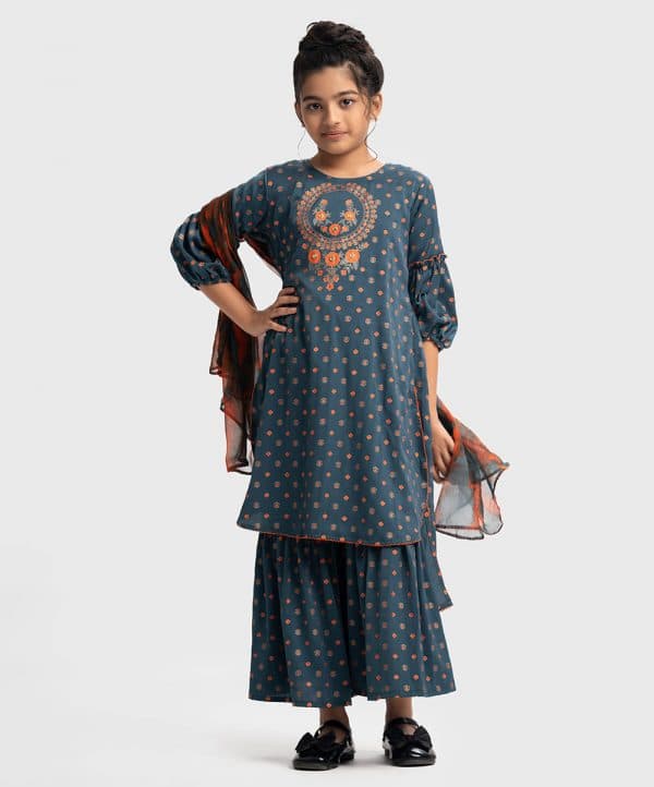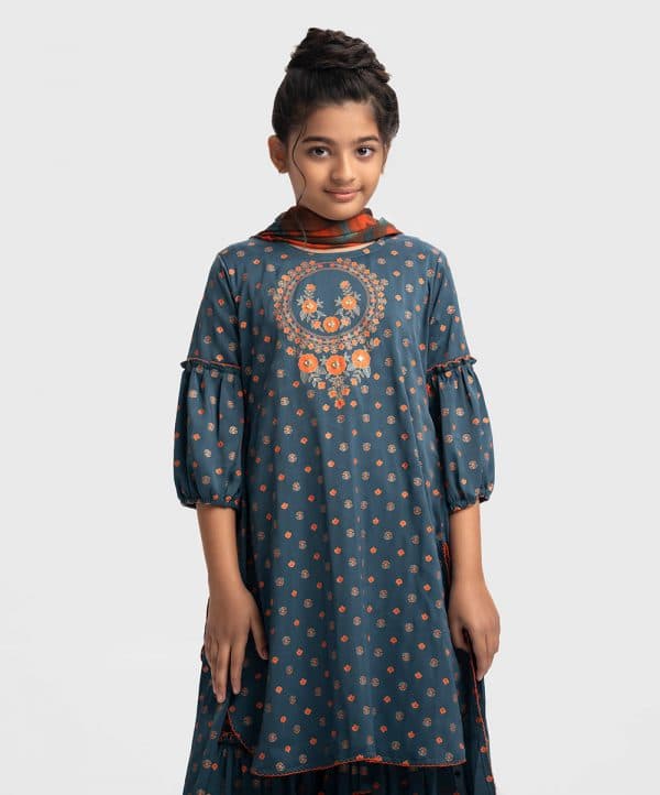 Trendy shara kameez set in joom fabric. Round neck, lantern sleeved kameez with high-low hemline and embroidery at the front. Half viscose lining inside. Complemented with an elasticated waist sharara.