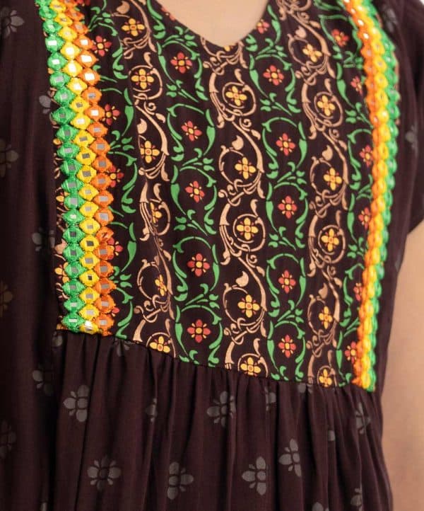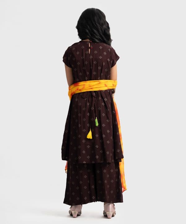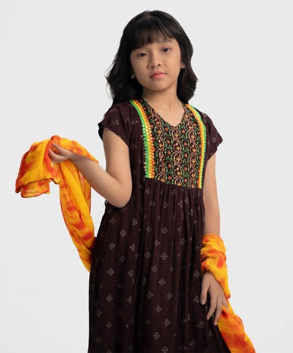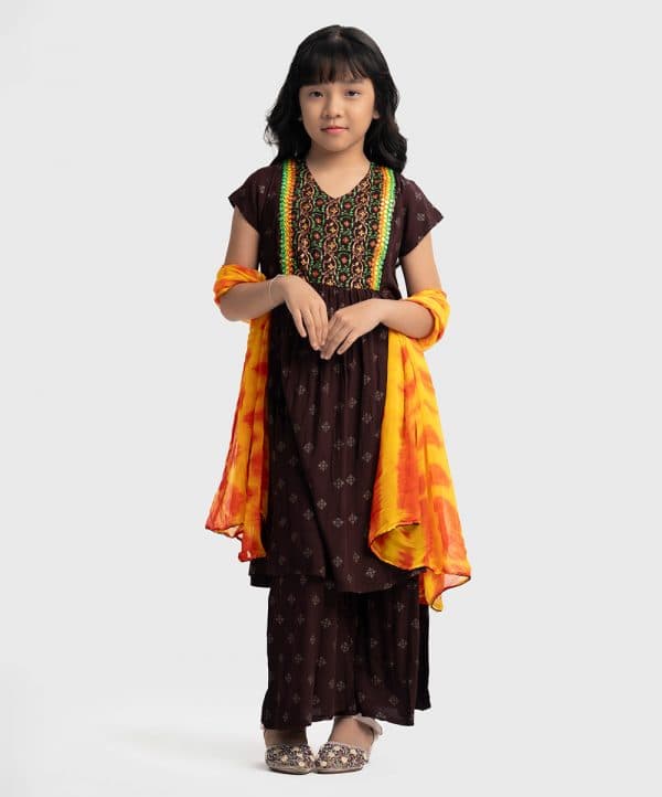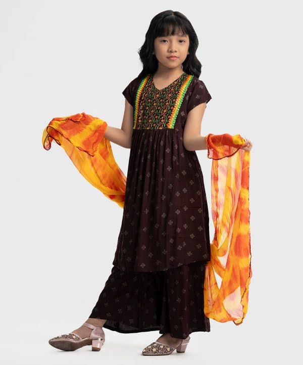 Kid girls printed A-line salwar kameez in viscose fabric. V-neck, cap sleeves, tassel tie at waistline and embroidery at the front of kameez. Palazzo pants and tie-dye chiffon dupatta.