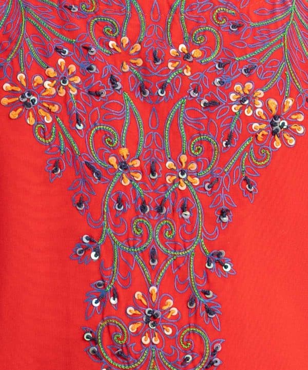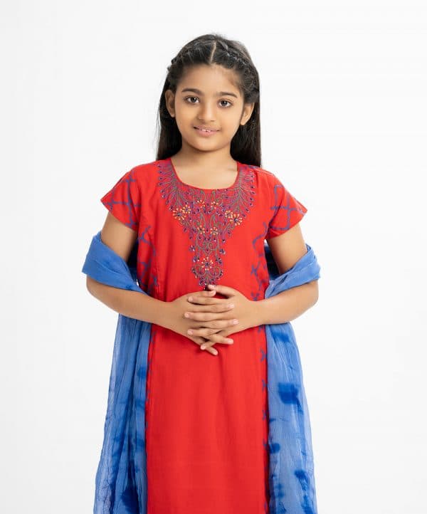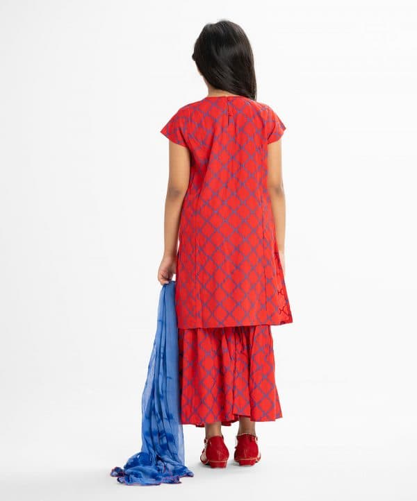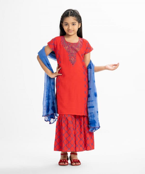Kid girls printed salwar kameez in viscose fabric. Cap-sleeved round neck kameez with karchupi at front. Tie-dye chiffon dupatta with sharara pajamas.