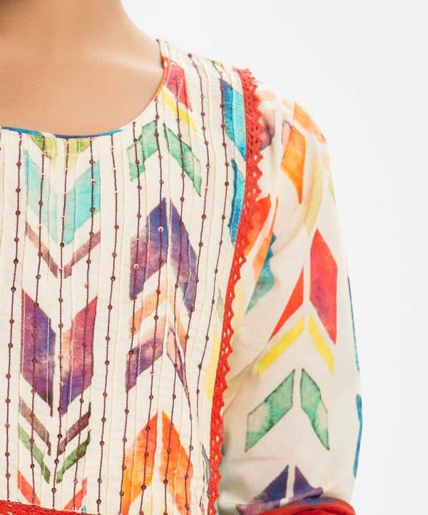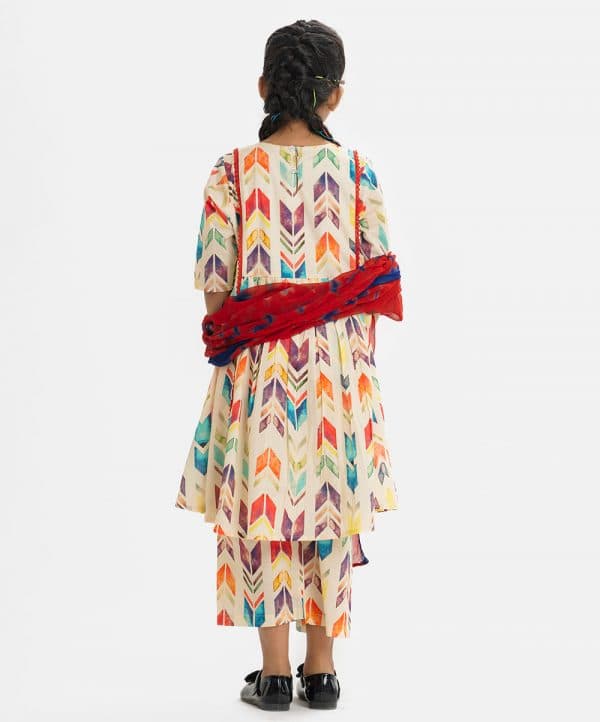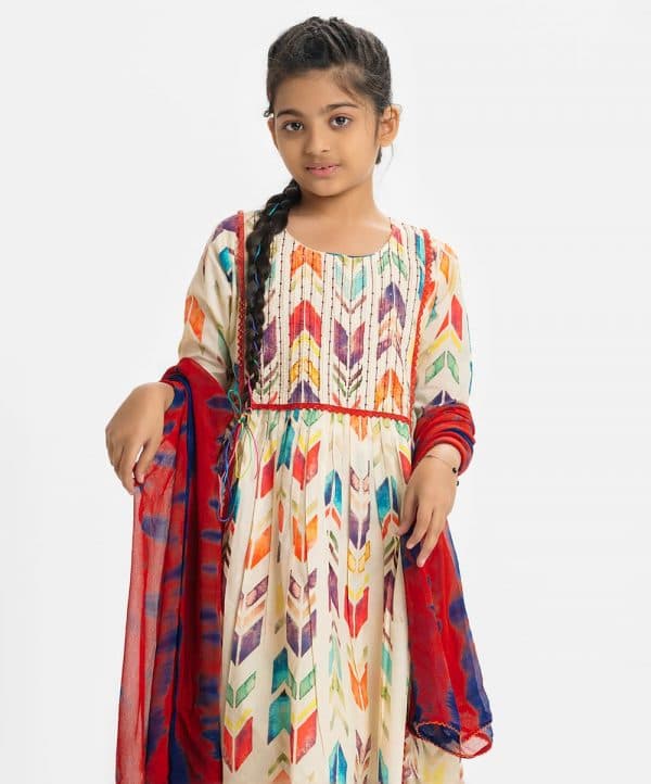Kid girls salwar kameez in cotton fabric. Stand collar, three-quarter sleeved and karchupi at the front. Complemented with pants and chiffon dupatta.