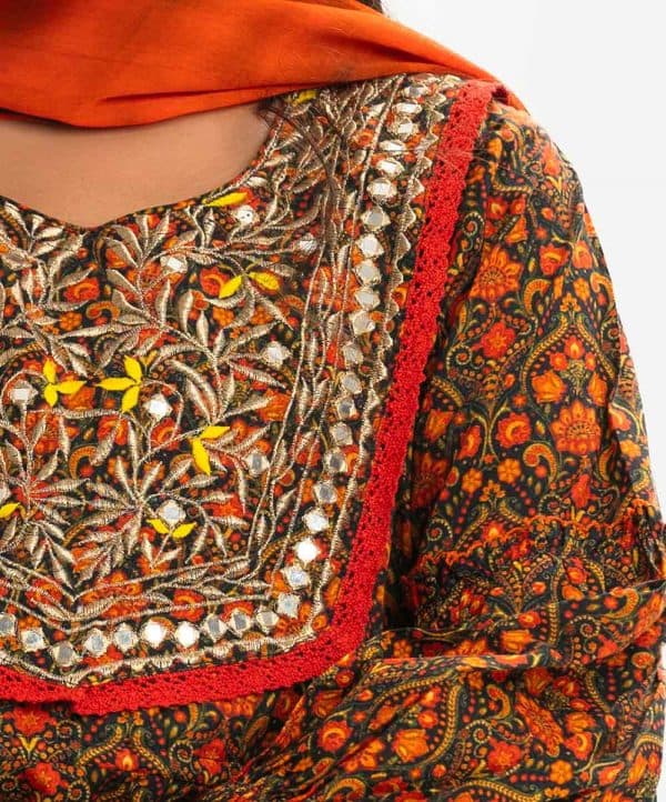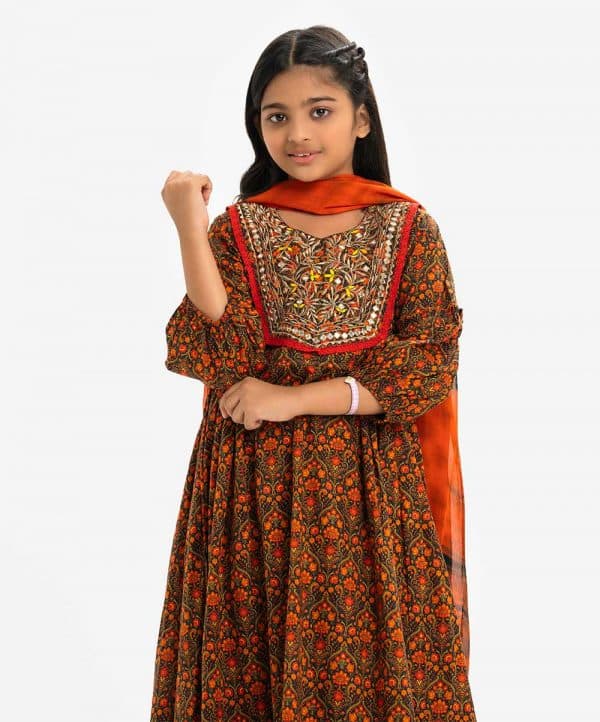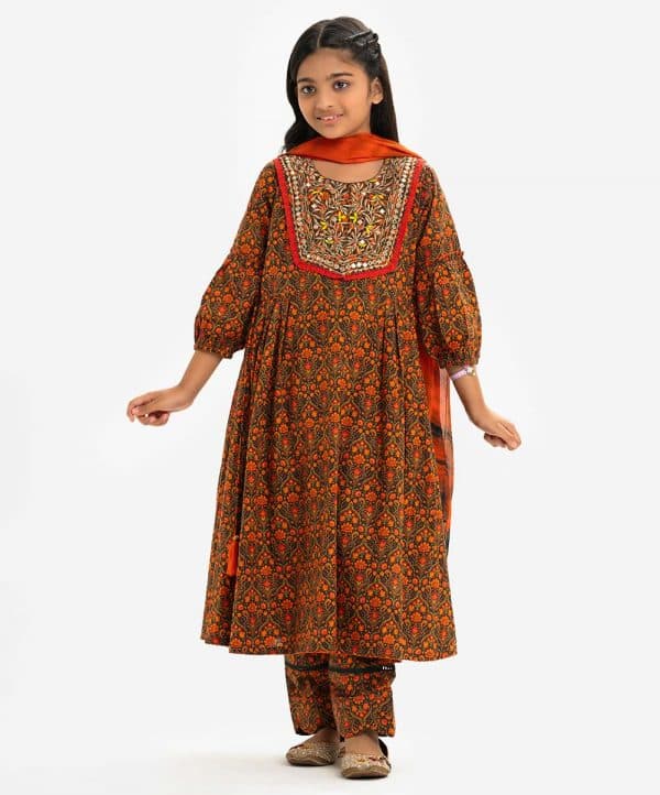 Kid girls printed A-line salwar kameez in cotton fabric. Round neck, three-quarter sleeved. Embroidery at the front with waistbelt. Paired with pant and tie-dye dupatta.