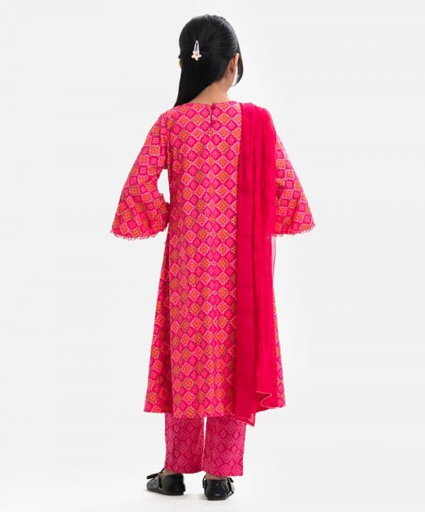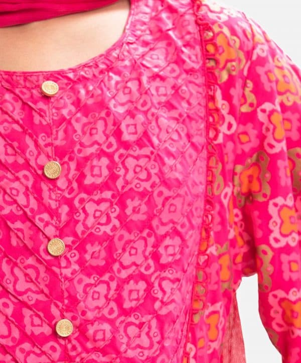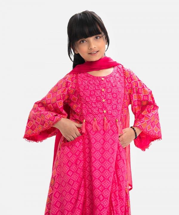 Patterned salwar kameez set in viscose fabric. Round neck, bell-sleeved with patch pockets. Lace and tassel details at the front. Complemented with an elasticated waist pajama.