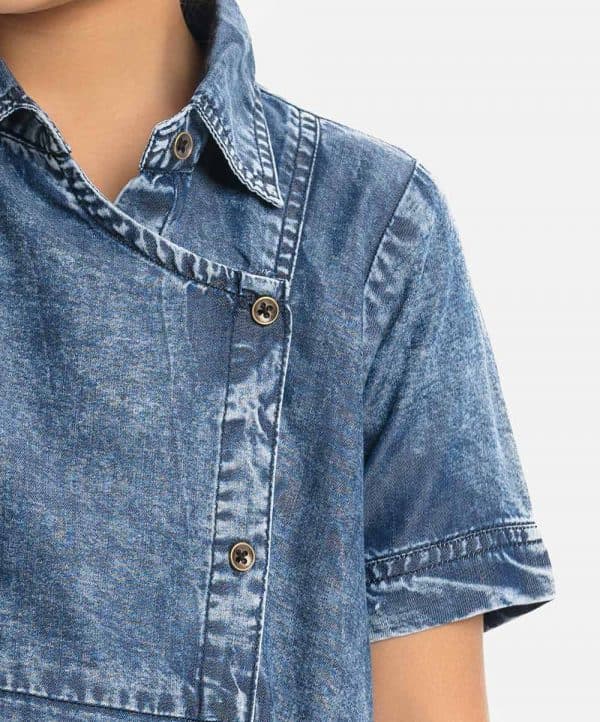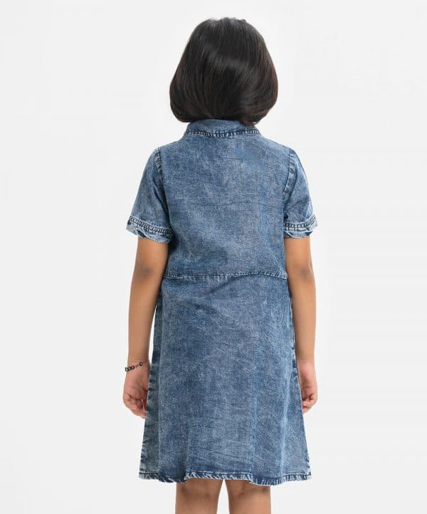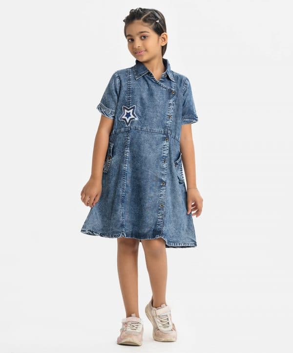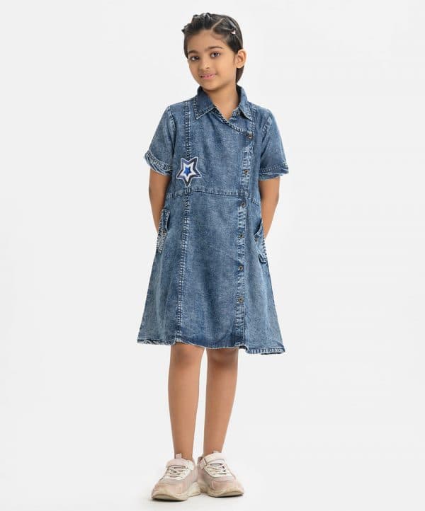 Kids girl A-line retro wrap style tunic in denim fabric. Classic collar, Short sleeved. Button fastening at the front. inseam pockets and attached patch at the front.