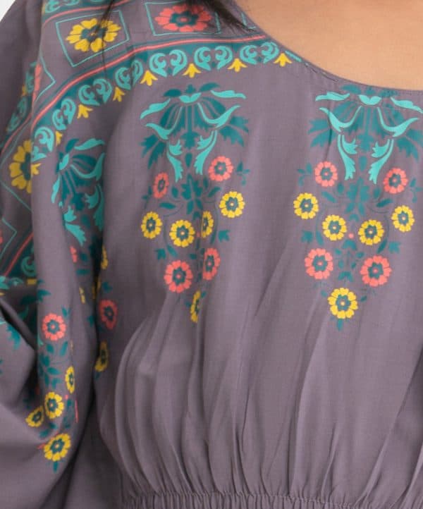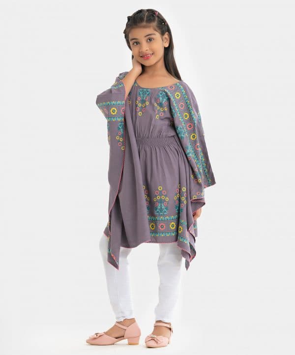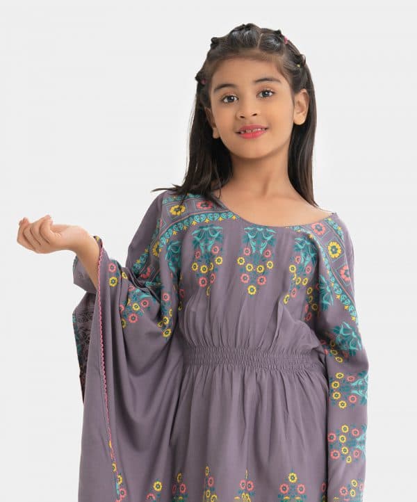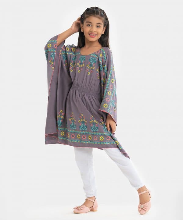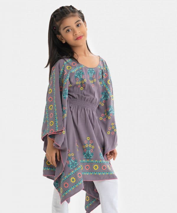 Kid girls kaftan tunic in viscose fabric. Round neck, elasticated at the waistline and floral print at hemline.