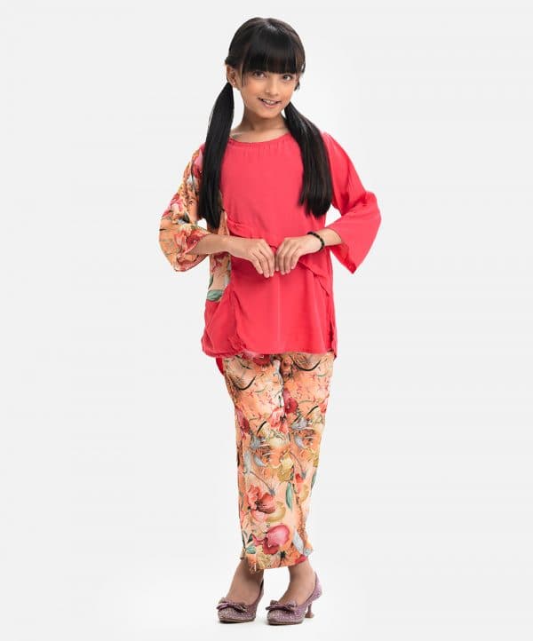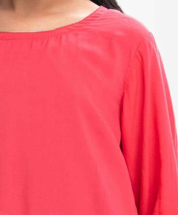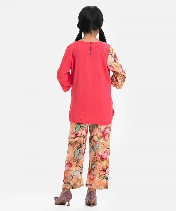 Round neck top in viscose fabric. Princess patterned with a front pocket and three-quarter sleeves. Long georgette pants with an elasticated waistline.