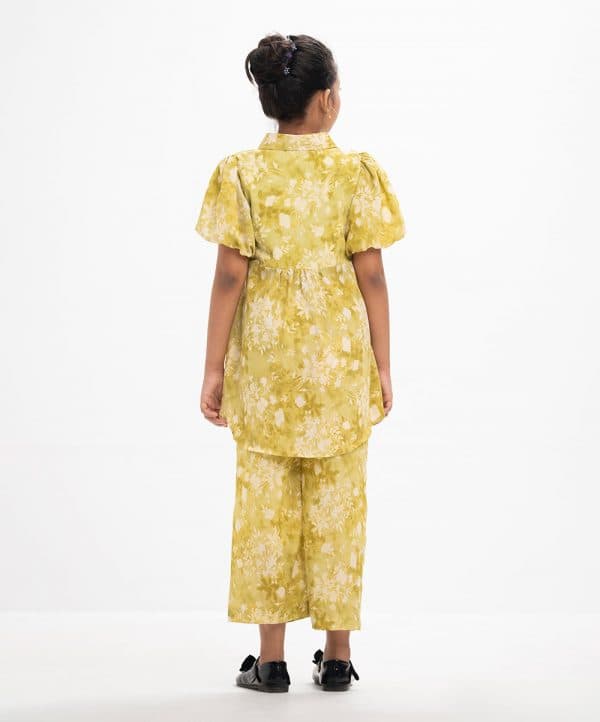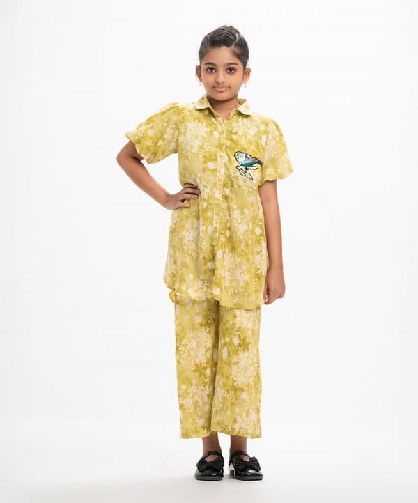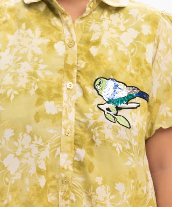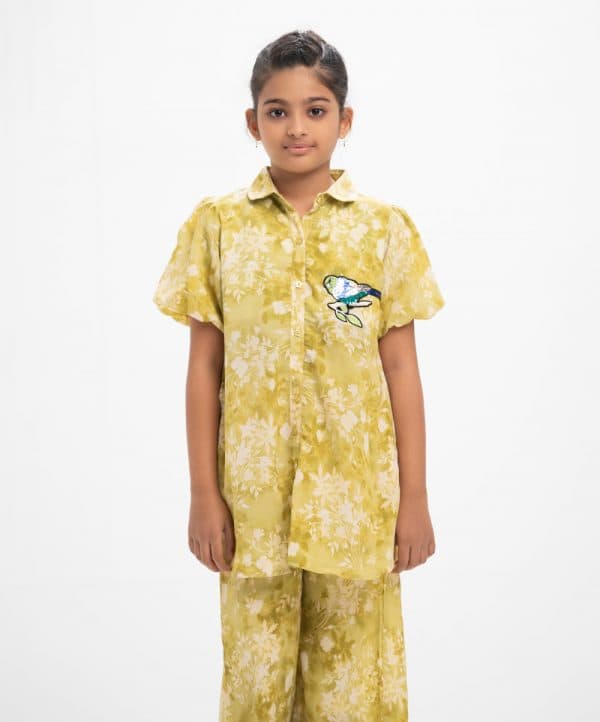 Shirt collar kameez in georgette fabric. Balloon puff sleeves, half viscose lining. Sequined bird embroidery at the front, inseam side pockets. Complemented with an elasticated waist pant.