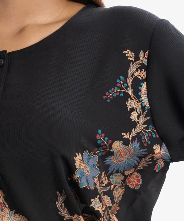 Women’s abaya-style gown in crepe fabric. Round neck with metal button placket, bell sleeves. Print detail at front, sleeves and hem. Two inseam side pockets.