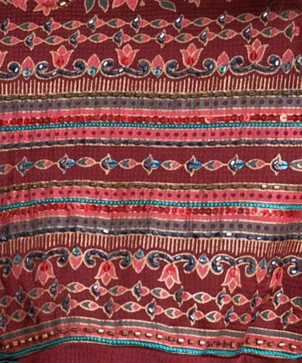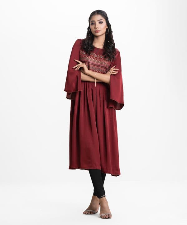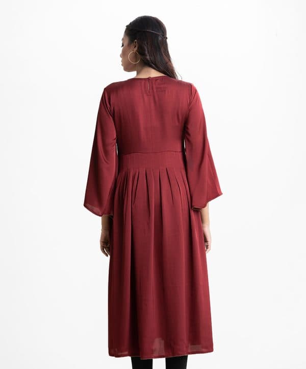 Women’s abaya-style gown in crepe fabric. Round neck, slit bell sleeves. Box pleated waistline. Karchupi and floral print detail at front.