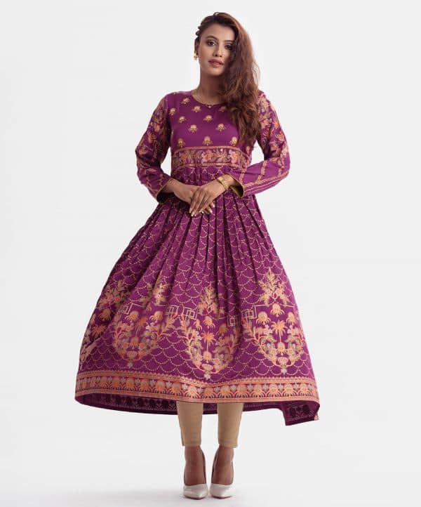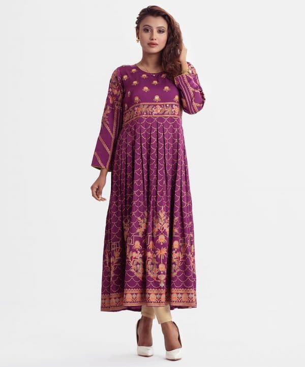 Printed A-line gown abaya in crepe fabric. Round neck, three-quarter sleeved. Karchupi at the front and box pleated at the waistline.