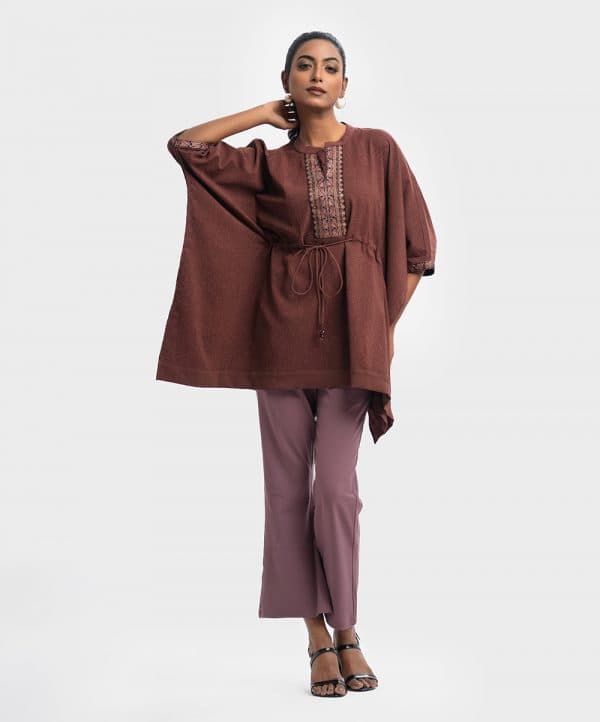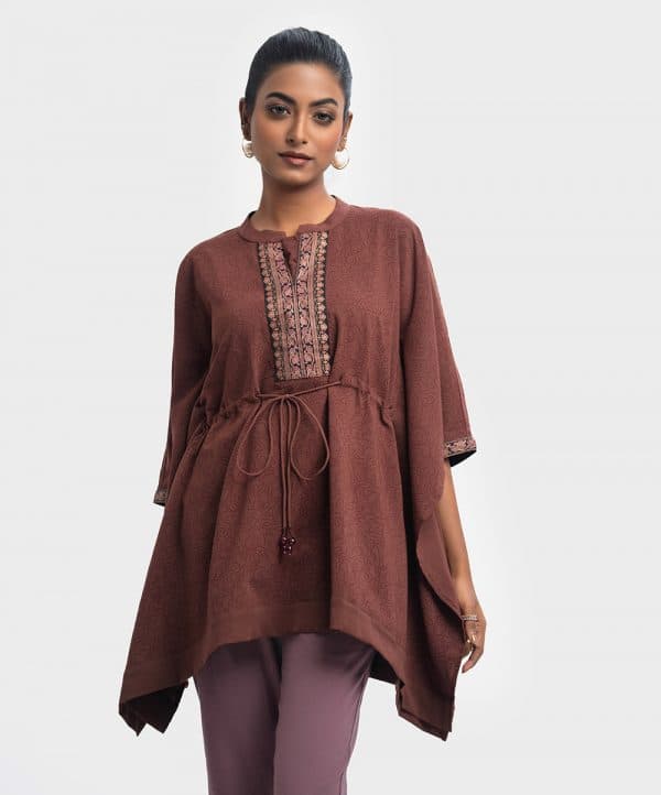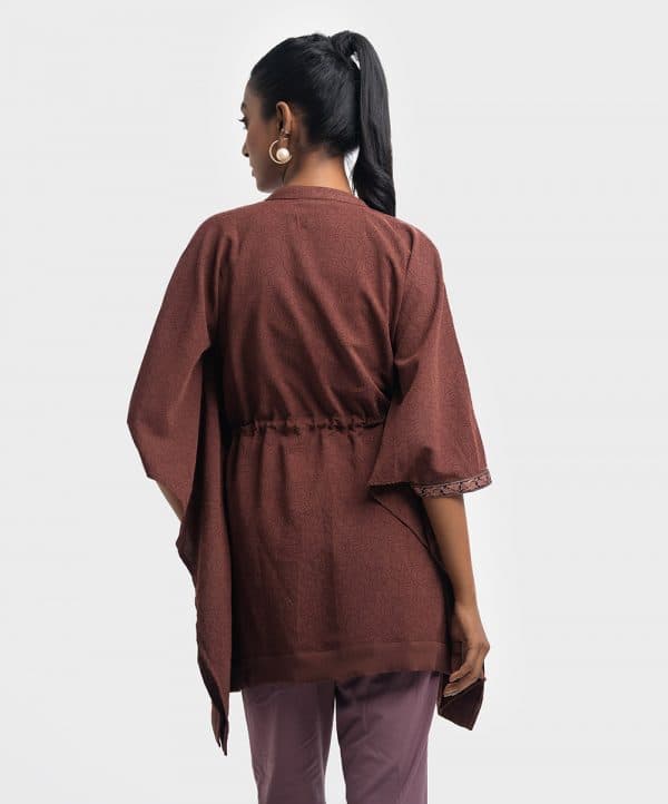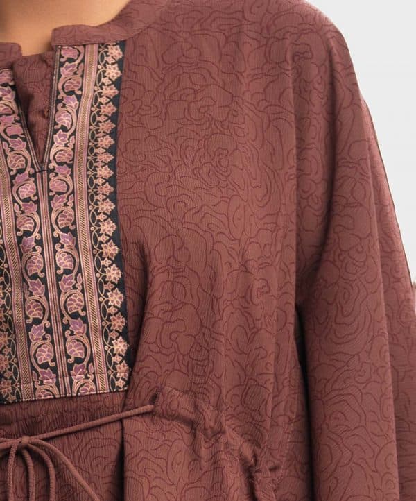 Floral printed abaya style kaftan in joom fabric. Stand collar with patch placket and front tassel tie.