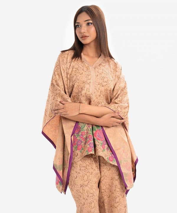 Women’s printed abaya style top-bottom set in jacquard fabric. Shawl collar top and palazzo pant.