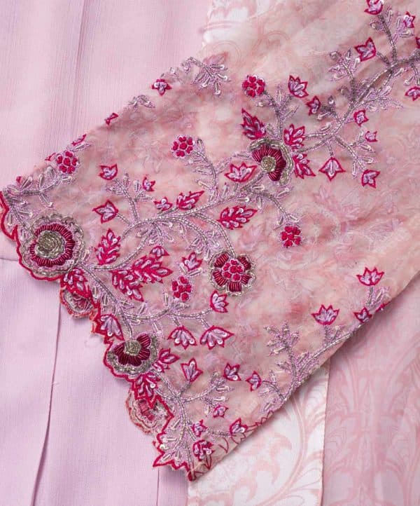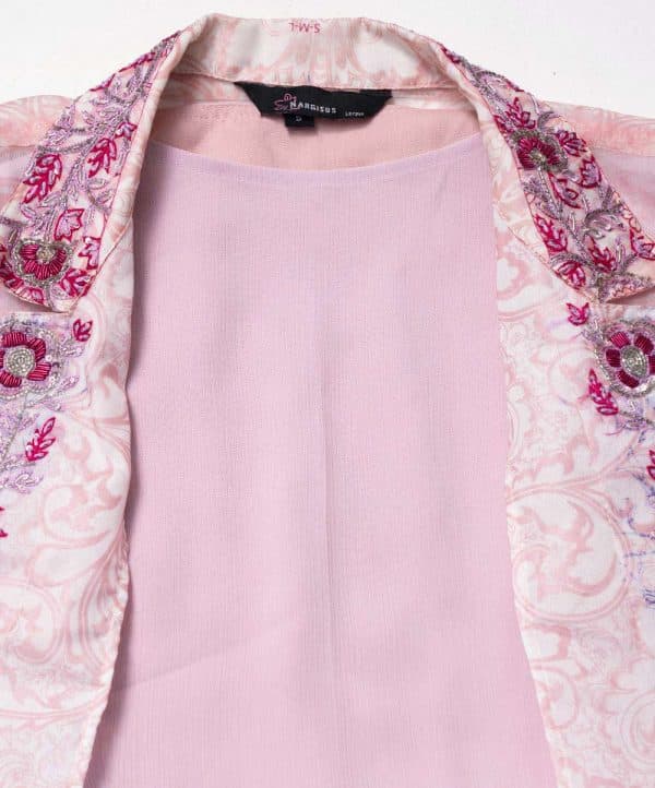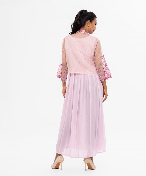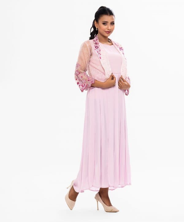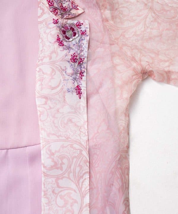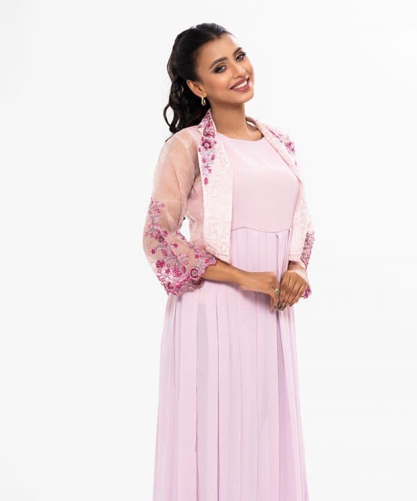 Pink long sleeveles Gown in Georgette fabric with box pleats from waistline. Complimented with a floral printed muslin koti, featuring a lapel coller and gorgeous karchupi.