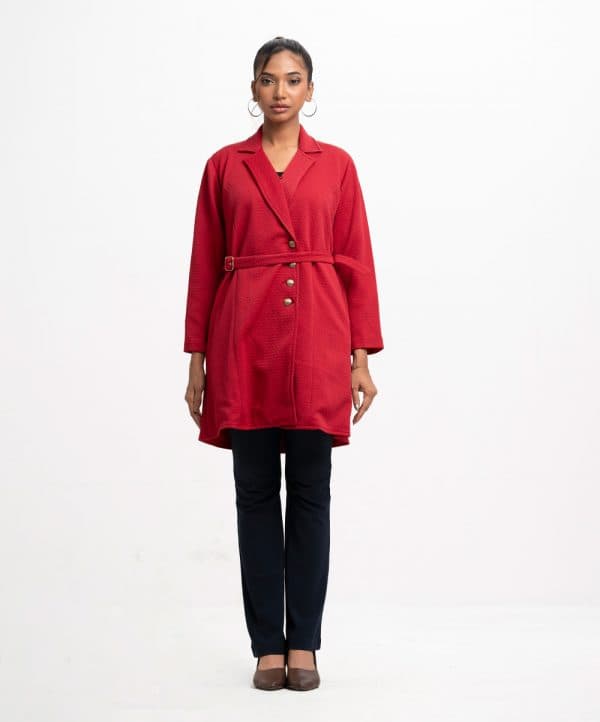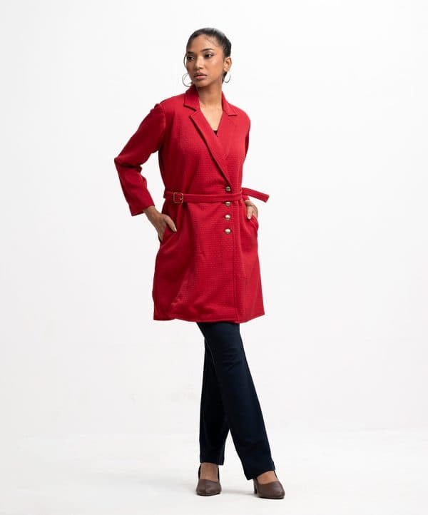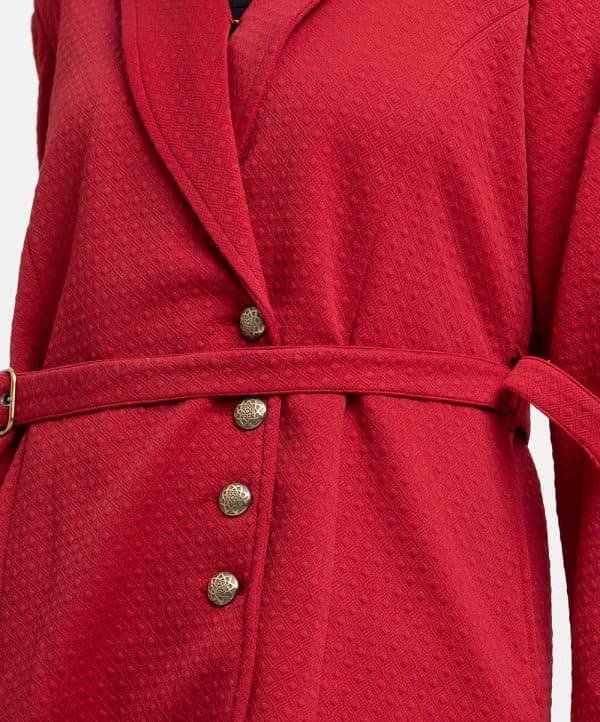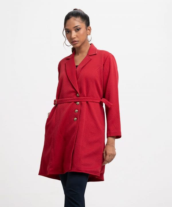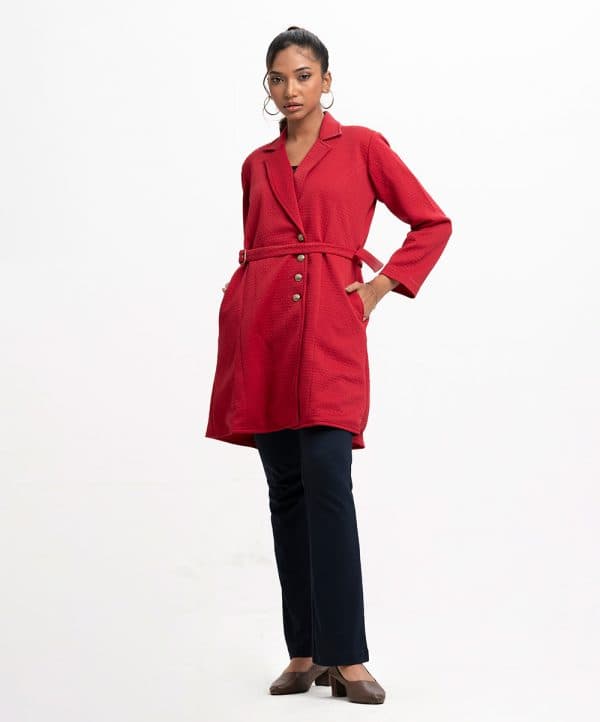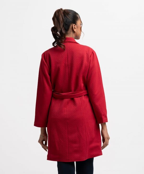 Women’s jacket in textured knit fabric. Lapel collar, long sleeves, button fastening at the front. Two side pockets and a detachable waist belt.
