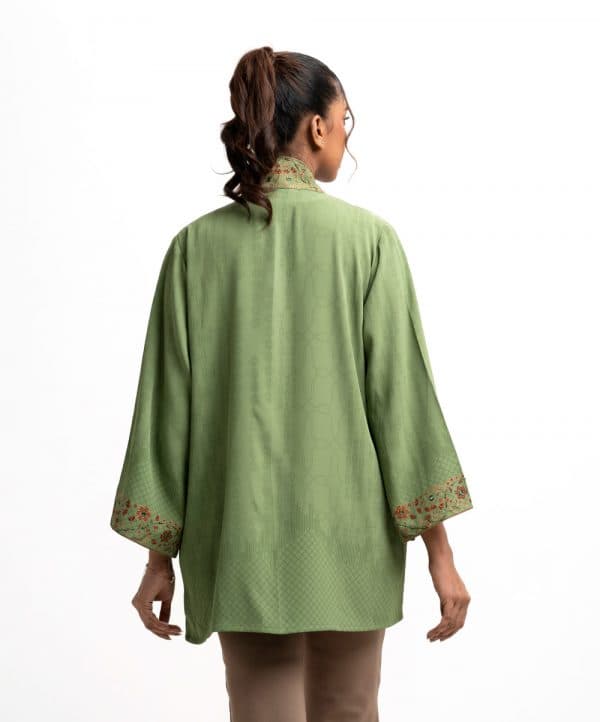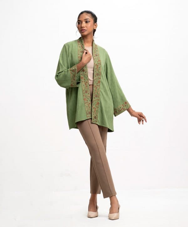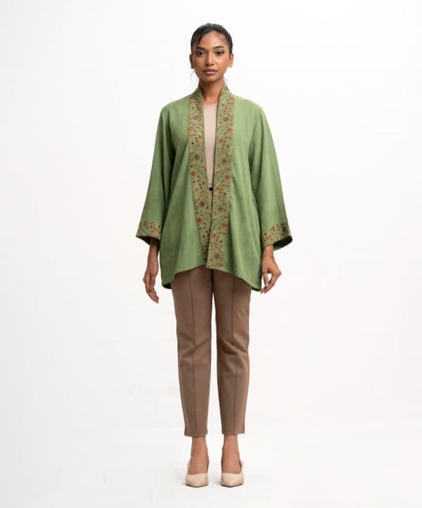 Women’s winter open front jacket in stretched tencel fabric. Full bell sleeves and inseam side pockets. Karchupi at front and sleeves.