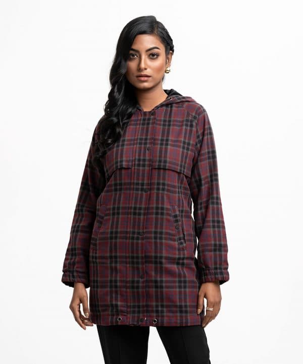 Women’s winter check hoodie Jacket in flannel fabric. Drawstring hood, full sleeves. Hidden zipper at front with show buttons & kangaroo pockets.