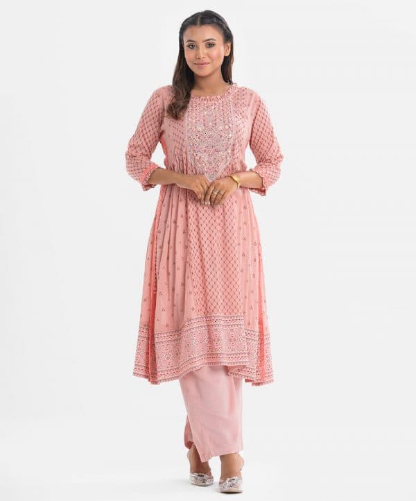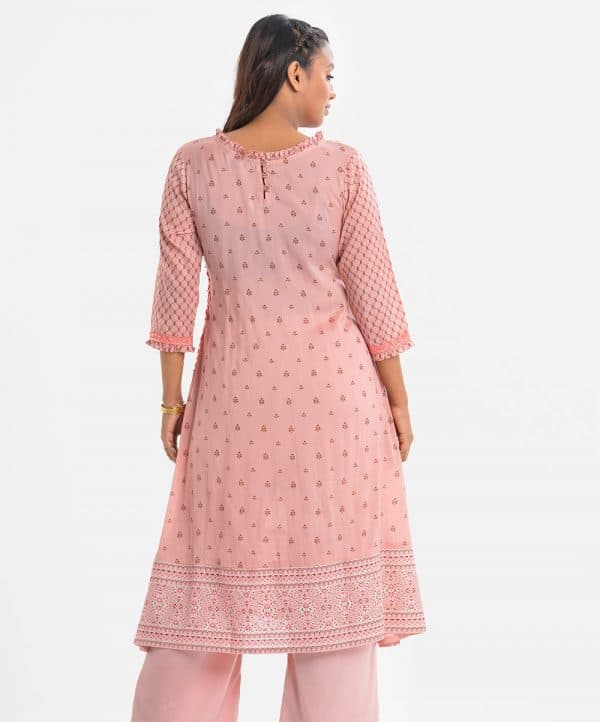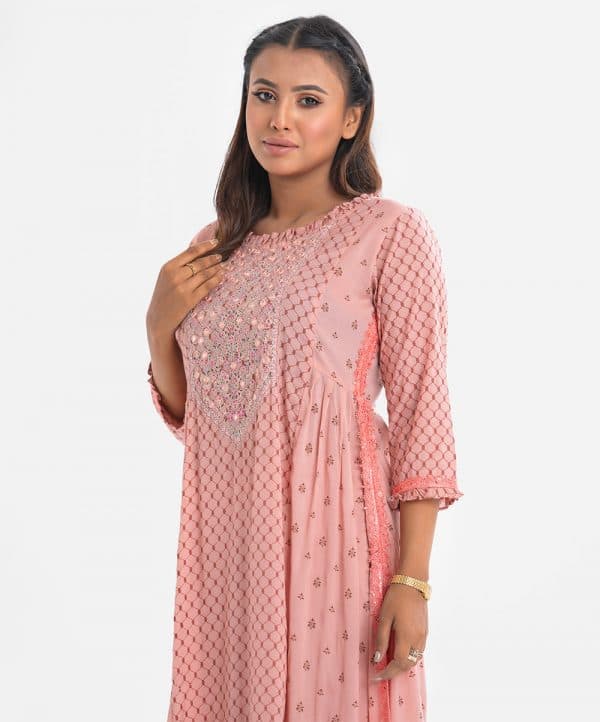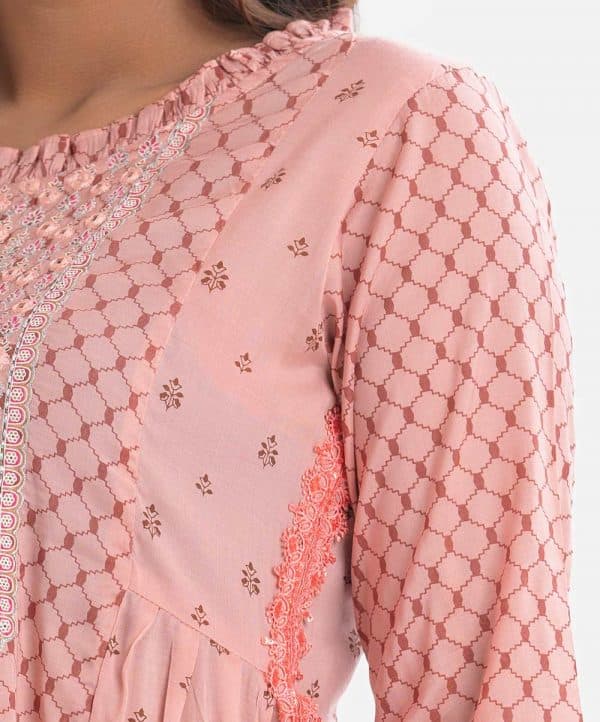 Women’s printed A-line maternity kameez in cotton fabric. Round neck with frills, three-quarter sleeves. Embroidery and karchupi at the front. attached lace at sides.