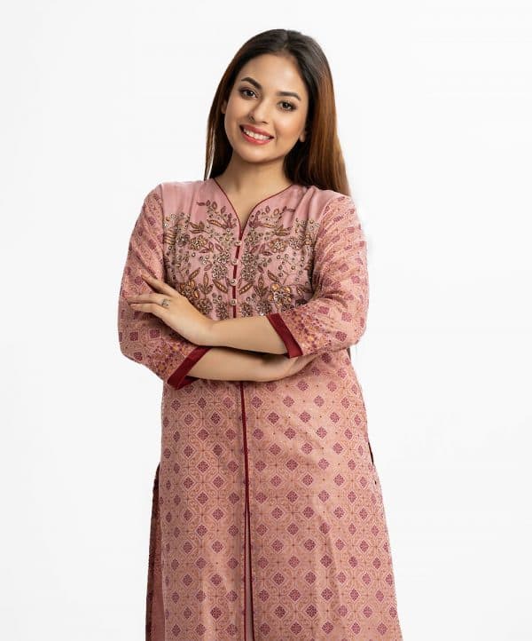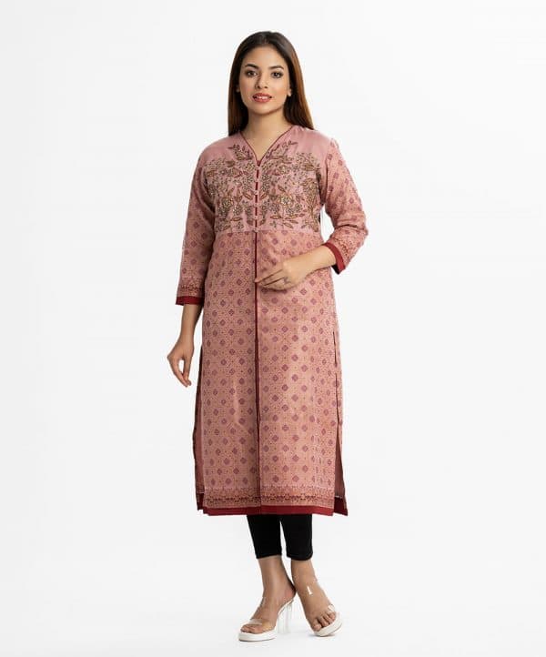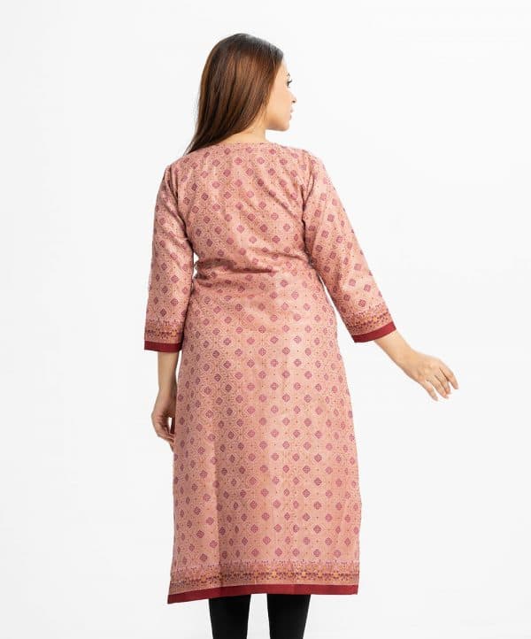 Women’s printed straight kameez in muslin fabric from Nargisus by LeReve. V-neck, three-quarter sleeved. Karchupi and slit at the front.