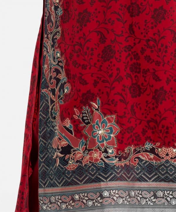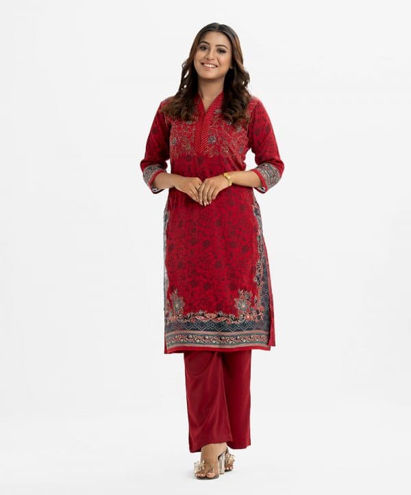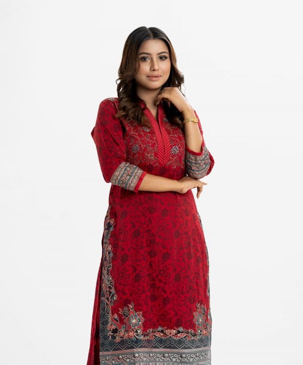 Printed straight kameez in zoom fabric. V-neck, three-quarter sleeved. karchupi at the front and hemline.