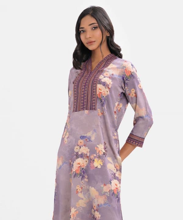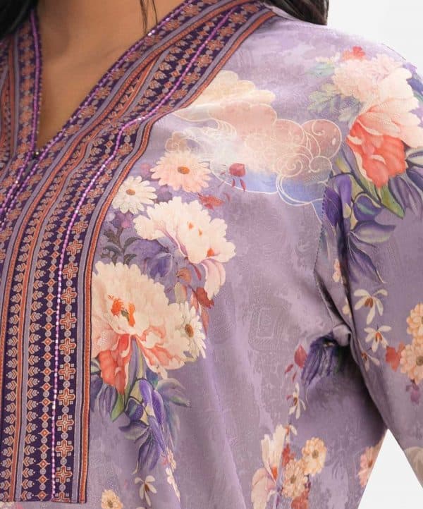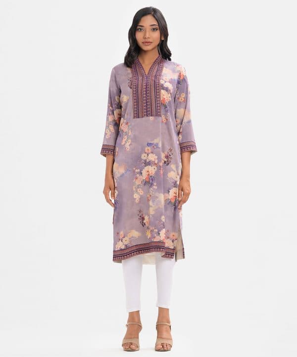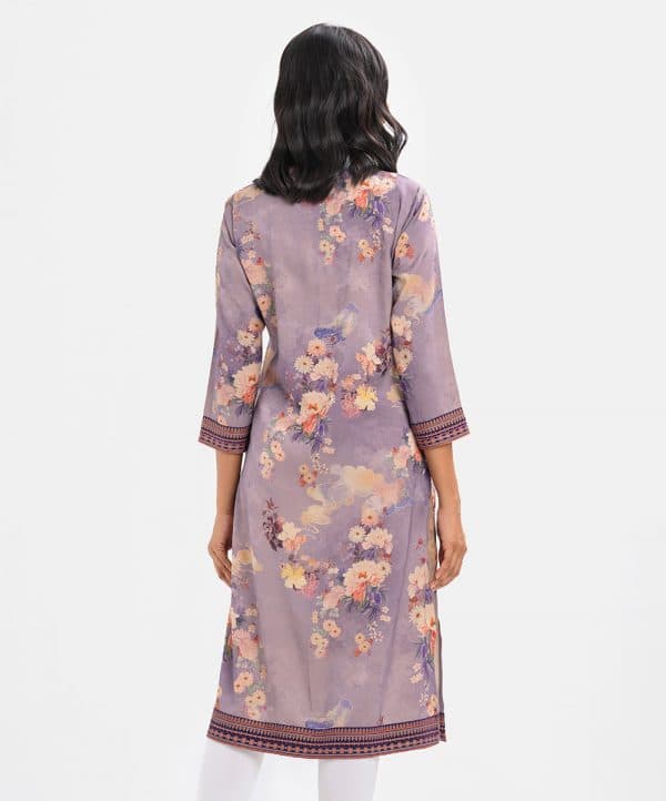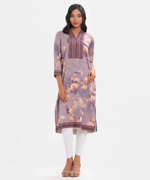 Women’s floral printed kameez in jacquard fabric. V-neck, three-quarter sleeves. karchupi at the front and sleeves. Patch at the hemline.