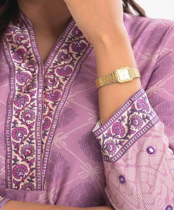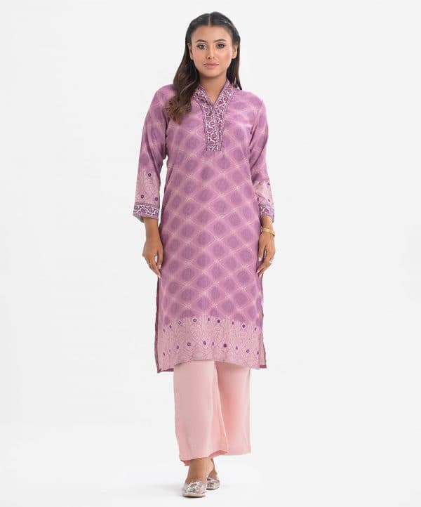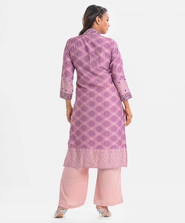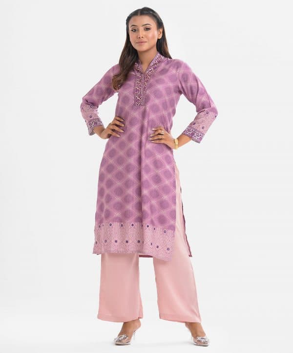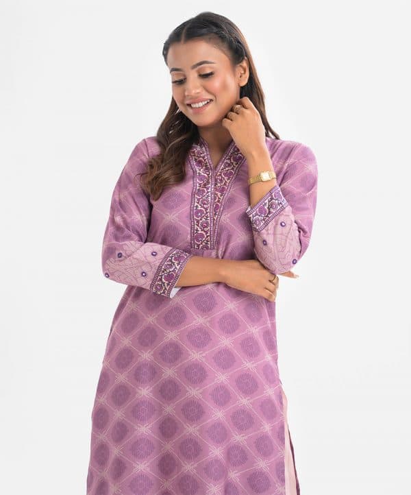 Women’s all-over printed straight kameez in faille fabric. Three-quarter sleeves, high collar. Karchupi at collar, sleeves and hem.