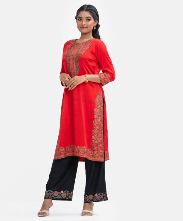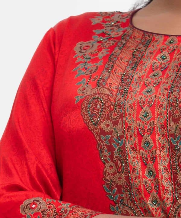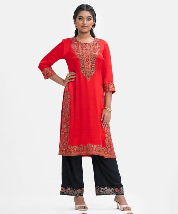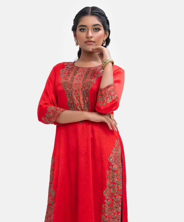Women’s exclusive straight kameez in Nargisus by Le Reve. Round neck, three-quarter sleeves. Floral print detail with karchupi at front, sleeves and hemline.