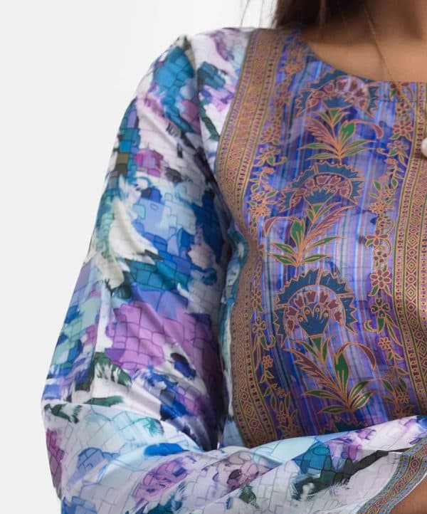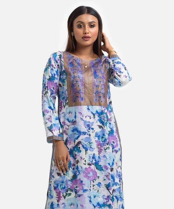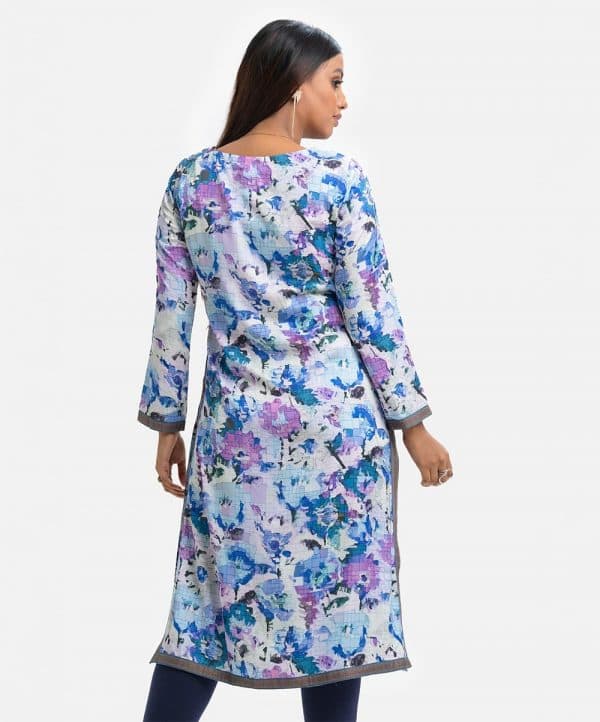 Women’s straight kameez in printed satin fabric. Full sleeves, boat neck. Muslin fabric patch at the front, sleeves and side borders.