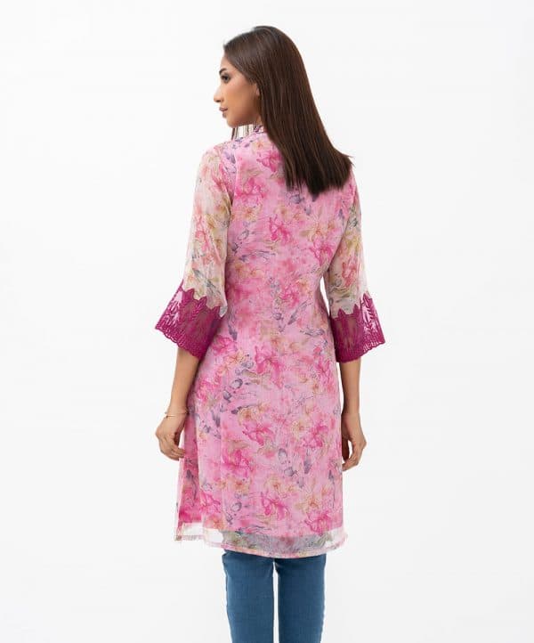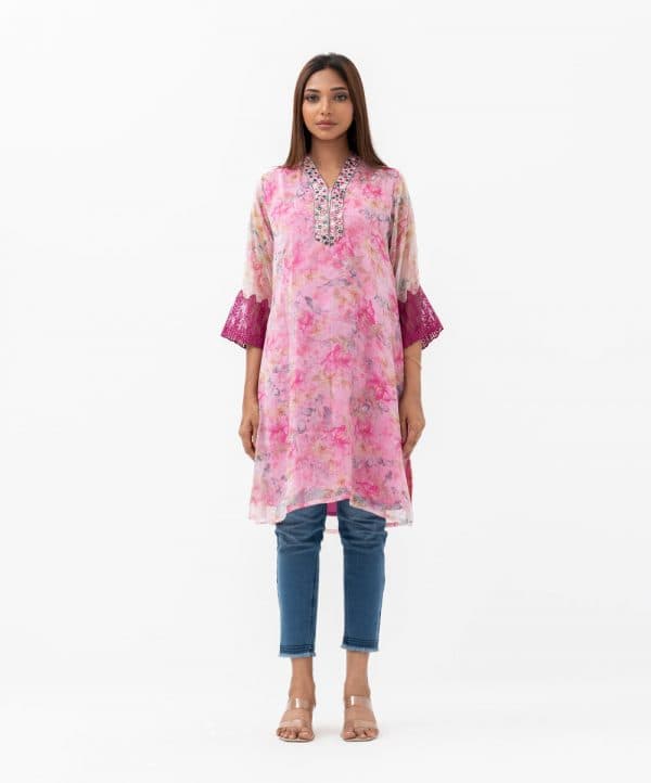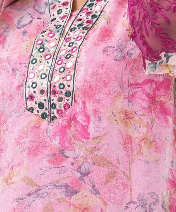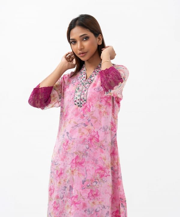 Women’s A-line kameez in printed georgette fabric with crepe lining. V-neckline with karchupi work, three-quarter sleeves with lace attached at cuff.