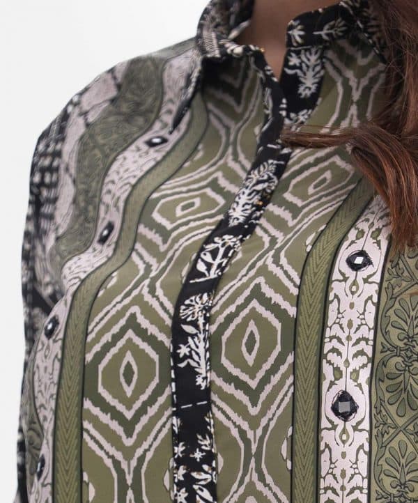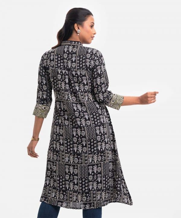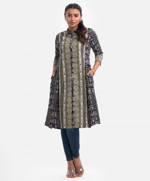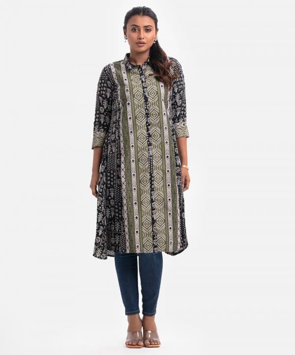 Women’s A-line kameez in printed georgette fabric. Three-quarter sleeves, classic collar. Print detail with karchupi at front and sleeves.