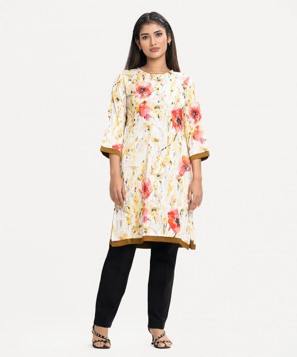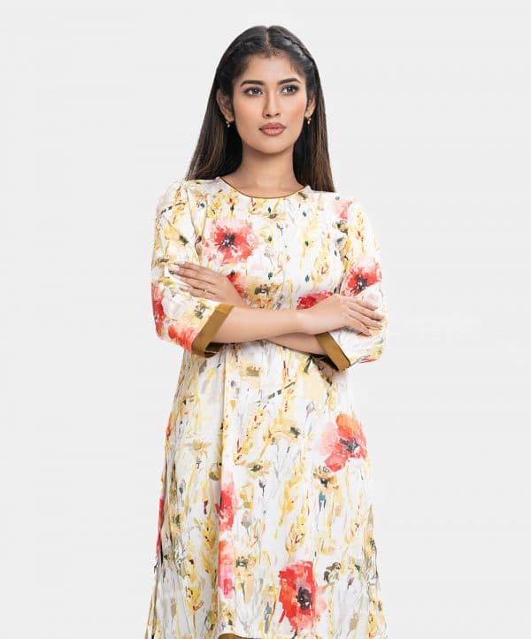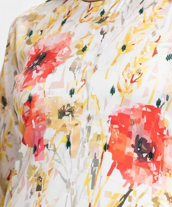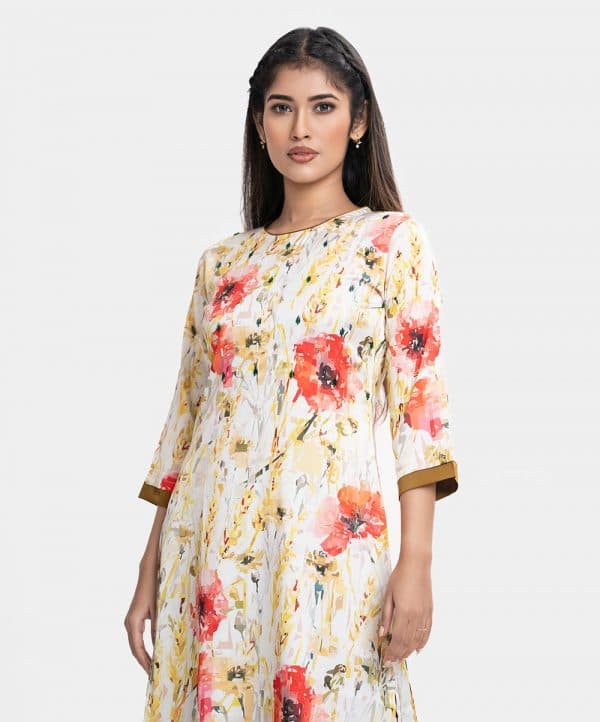 Round neck A-line kameez in soft amino satin fabric. Three-quarter sleeves, karchupi at the front.