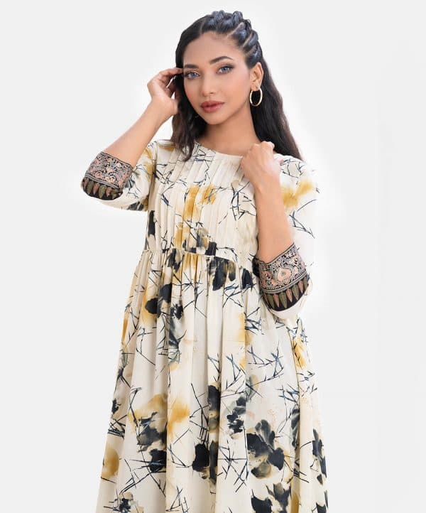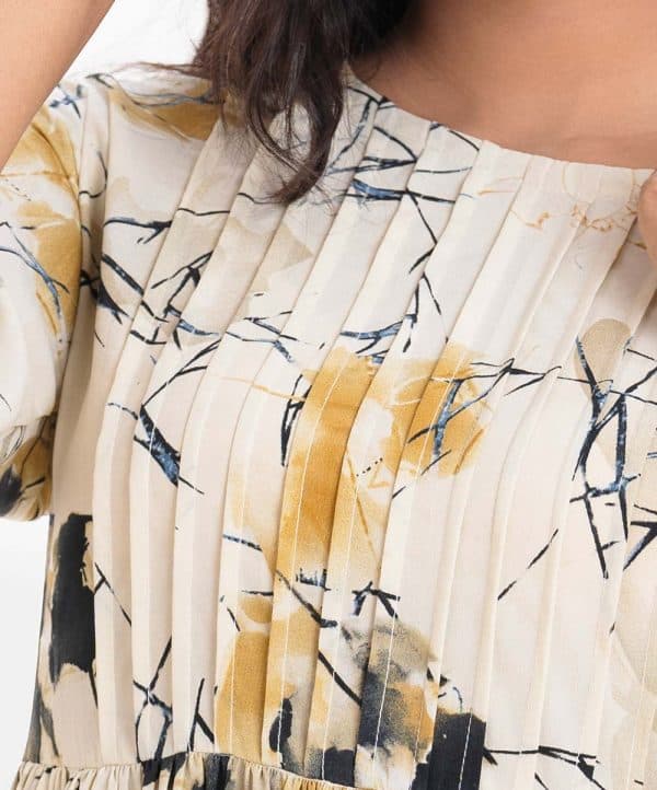 Women’s A-line long tunic in printed Georgette fabric. Round neck, three quarter sleeves. Pin tuck at front and gathered waistline.