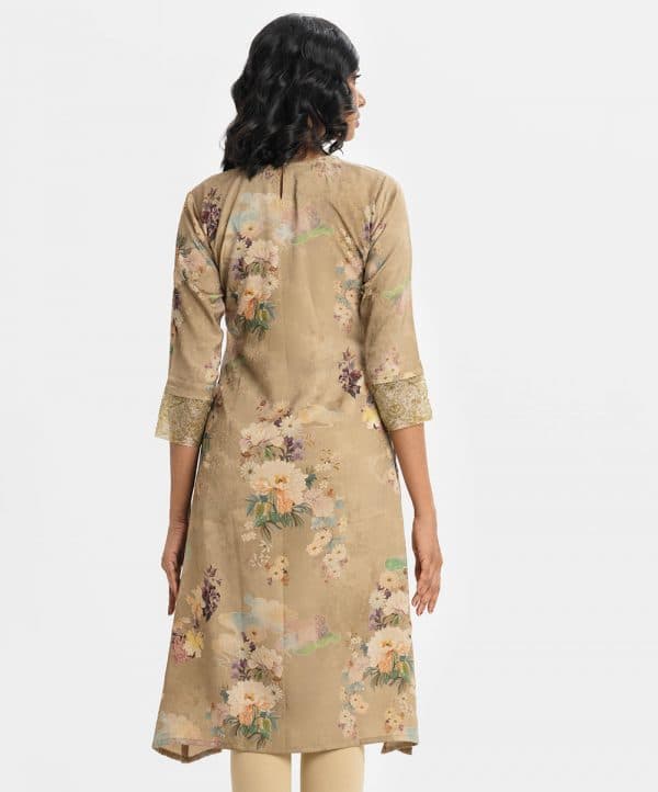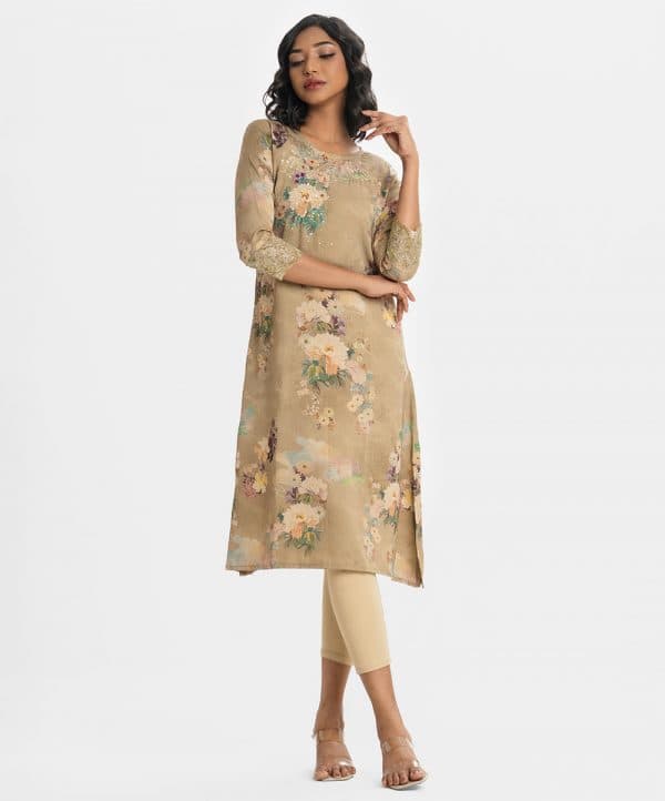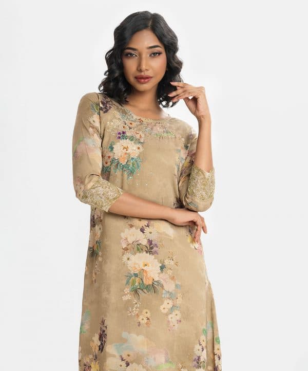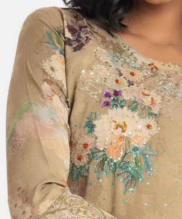 Women’s floral printed A-line long tunic in jacquard fabric. Long sleeves with the attached patch, round neck and karchupi at the front.
