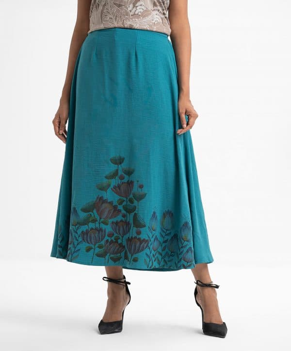 Women’s skirt in stretchable georgette fabric. Concealed elasticated waistline with side hidden zipper. Floral print detail at front and inseam pockets.
