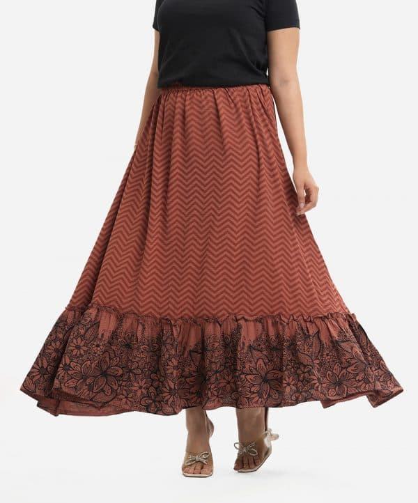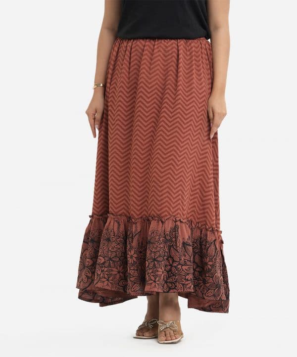 Women’s flared chevron printed skirt in stretchable georgette fabric. Concealed elasticated waistline. Frill and floral print detail at hemline.