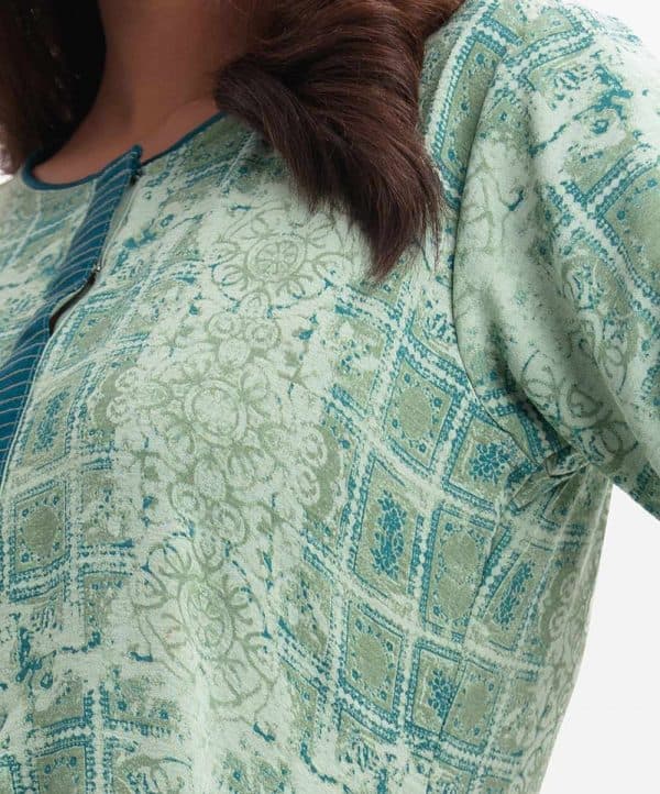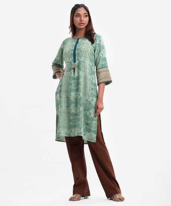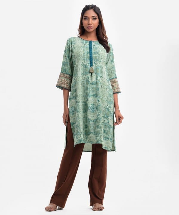 Women’s printed A-line maternity tunic in stretchable georgette fabric. Round neck with placket and bell sleeves. Tassel attached at placket and lace attached at sleeves.