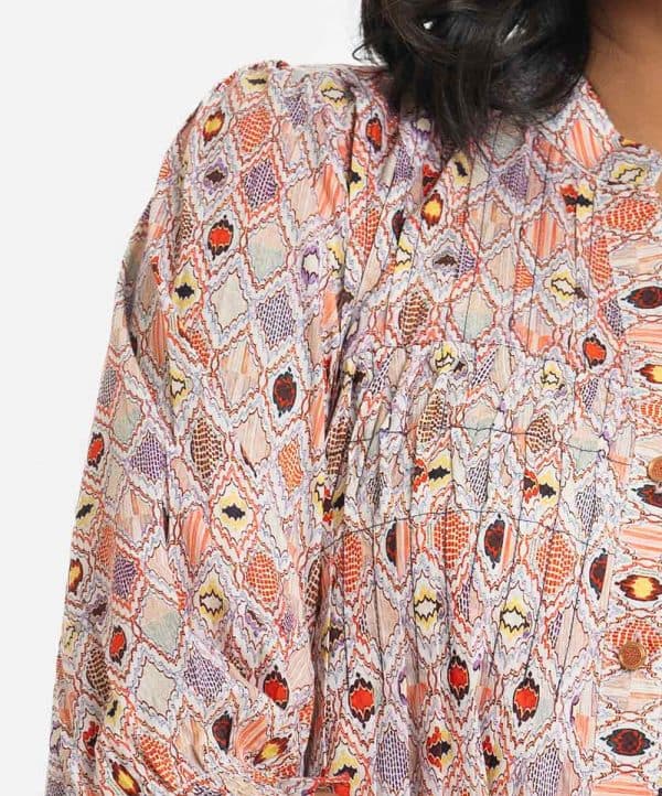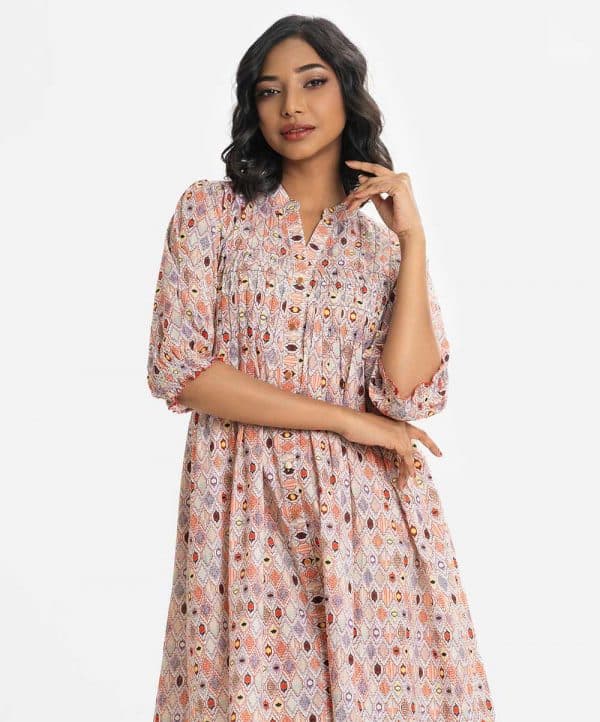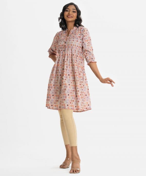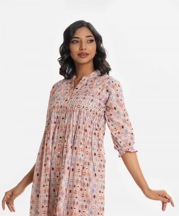 Women’s printed A-line tunic in cotton fabric. Stand collar, three-quarter sleeves. Diamond pintuck and button fastening at the front.