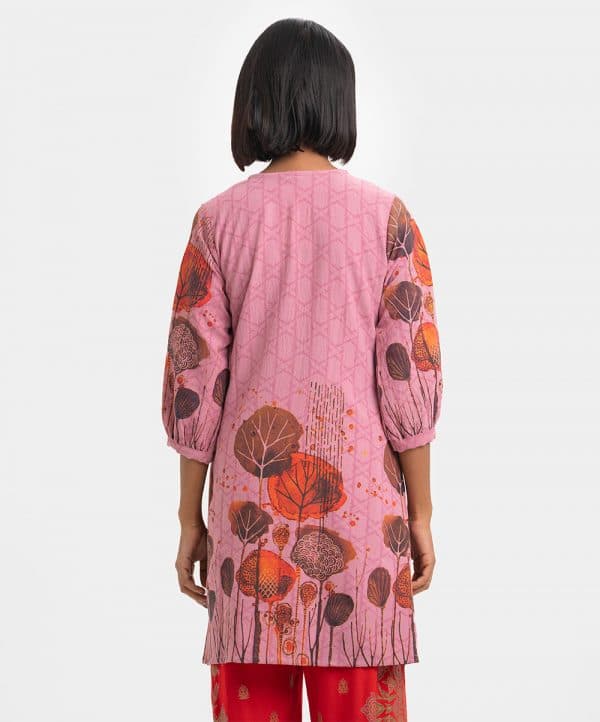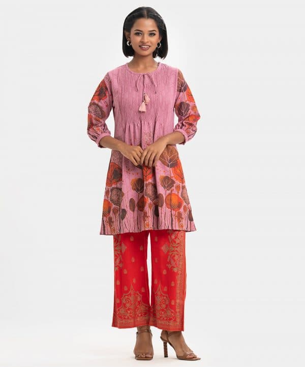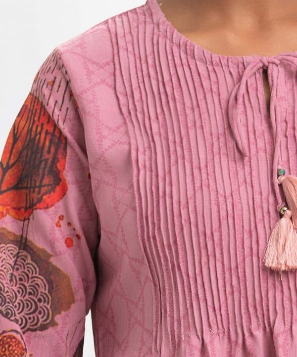 Women’s printed A-line tunic in stretchable georgette fabric. Round neck with slit attached tassel tie, bishop sleeves. Pintuck detail at front.