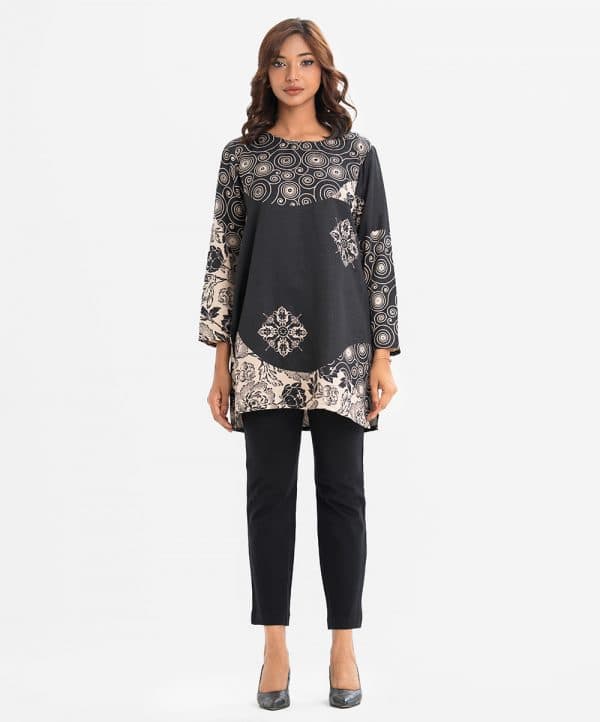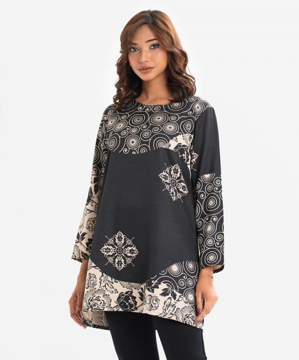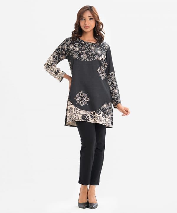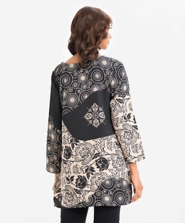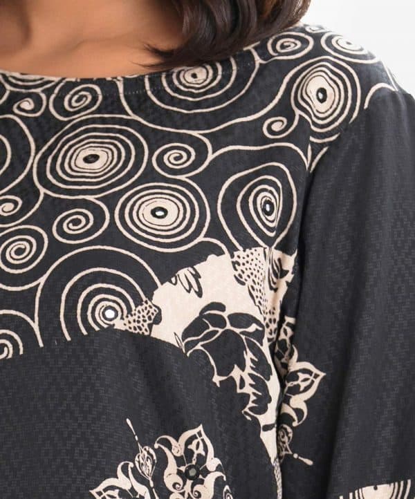 Women’s sheath-style tunic in blended fabric. Featuring a boat neckline, full sleeves and karchupi details at the front.