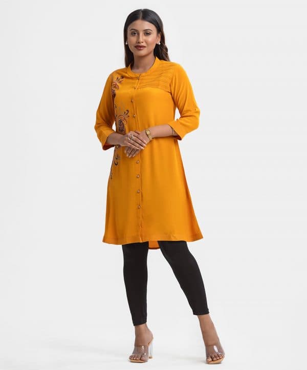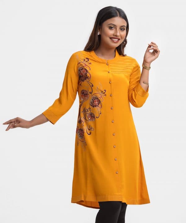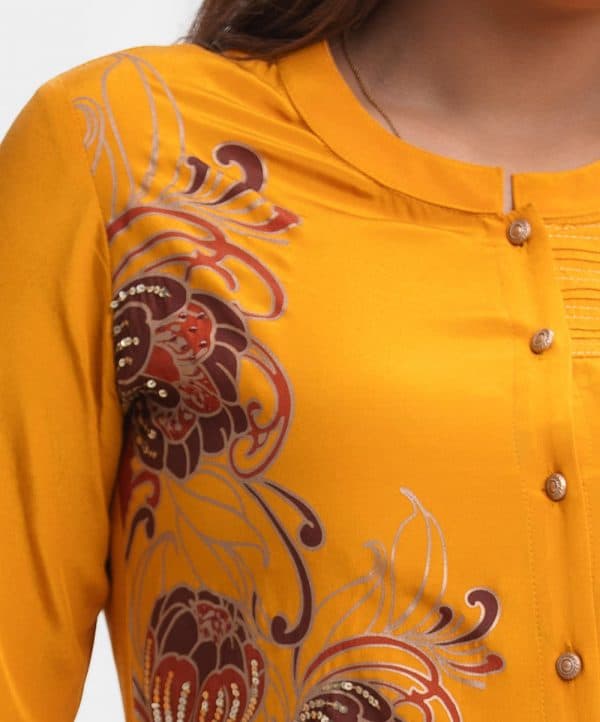 Women’s exclusive tunic in Nargisus by Le Reve. Shirt style tunic in silk and viscose blended fabric. Stand collar, three-quarter sleeves. Print with karchupi, pintuck and line stitching detail at front and sleeves.