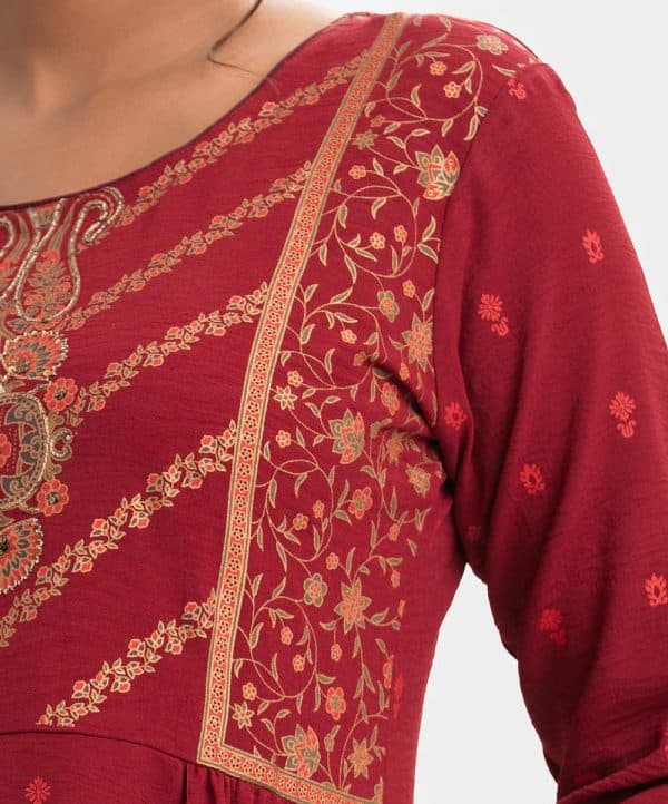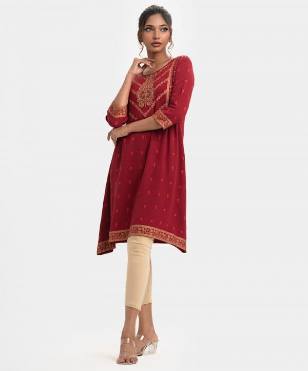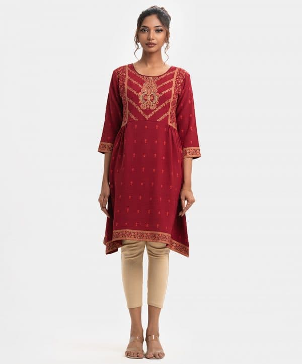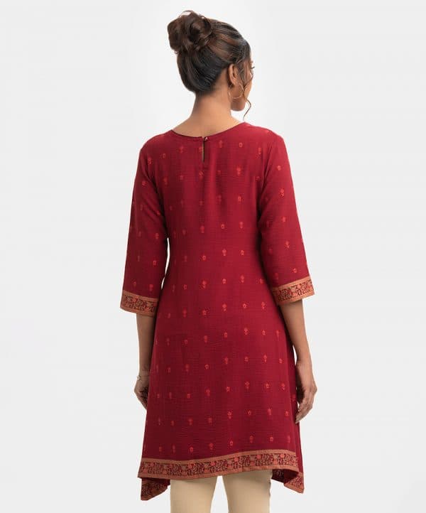 All over screen printed A line tunic with quarter sleeve and round neck. carchupi is added with print at half body.