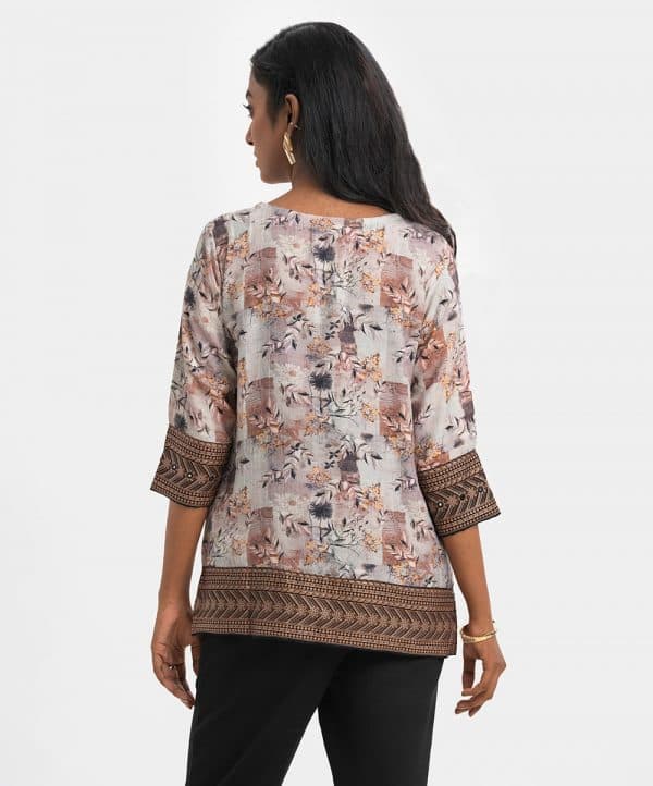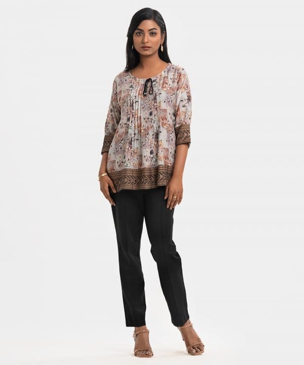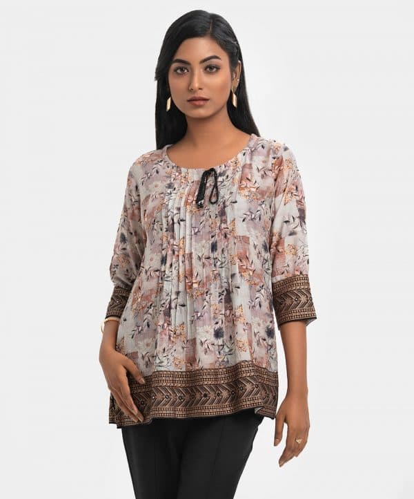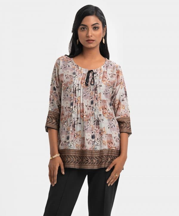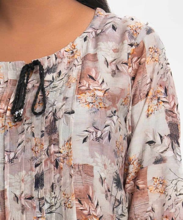 Women’s short style tunic in printed cotton-blended fabric. Three-quarter sleeves and round neck with slit attached tassel tie. Pin tuck at the front and patchwork & karchupi at sleeves and hemline.