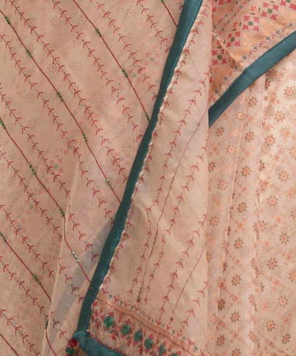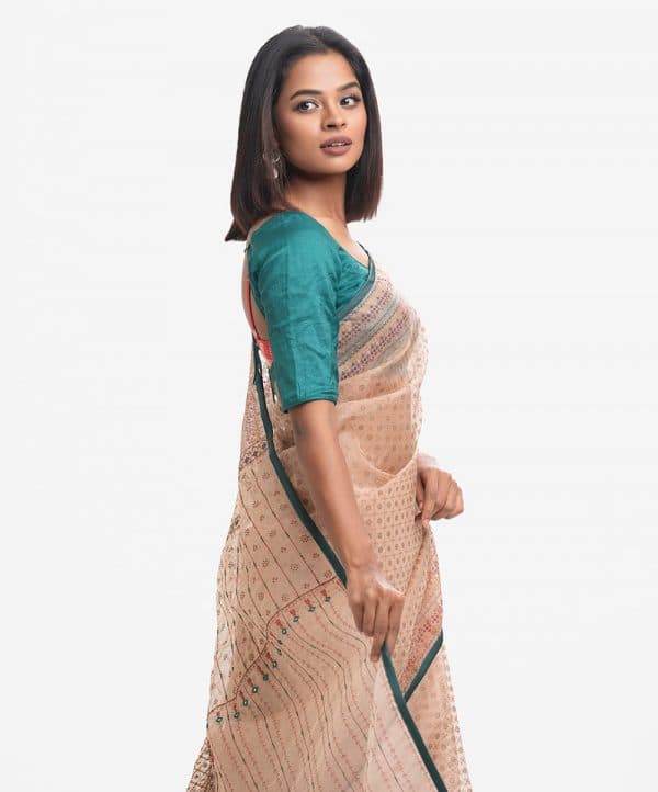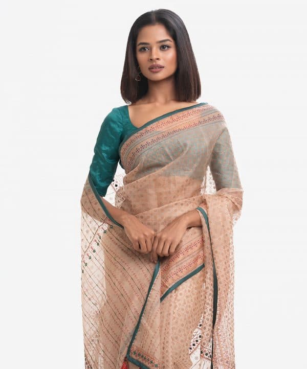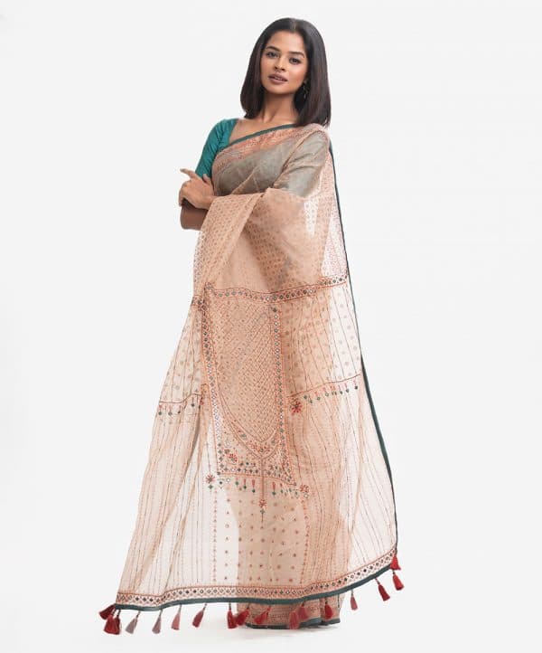 Women’s exclusive printed saree in muslin fabric. Heavy Karchupi at achal, patchwork at the border and added tassels.