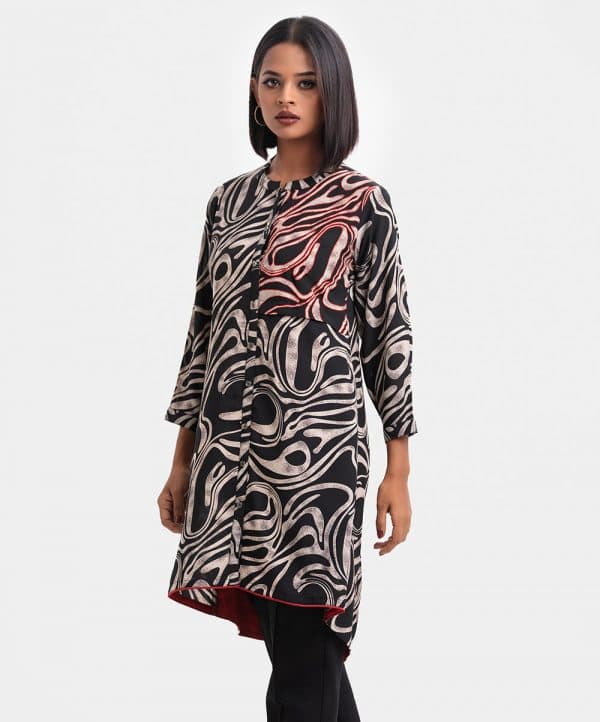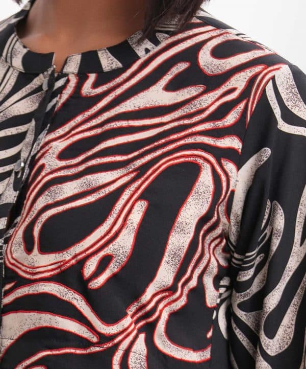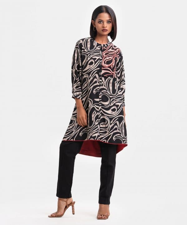 Ladies’ A-line shirt in printed georgette fabric. Stand collar with placket, buttons cuff sleeves. Embroidery patch at front and inseam pockets.